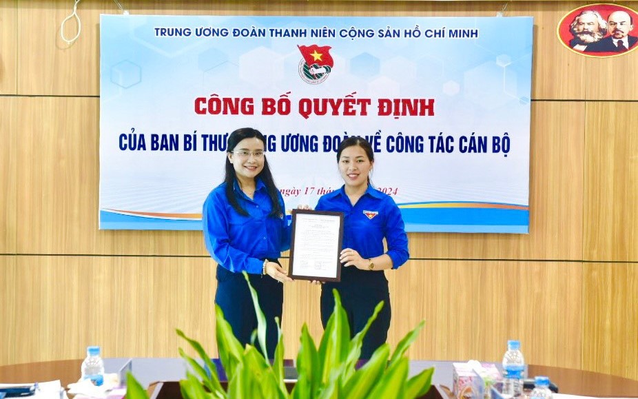 Đồng chí Nguyễn Phạm Duy Trang - Bí thư Trung ương Đoàn, Chủ tịch Hội đồng Đội Trung ương trao Quyết định công nhận Phó Bí thư Tỉnh Đoàn cho đồng chí Nông Thị Nhung