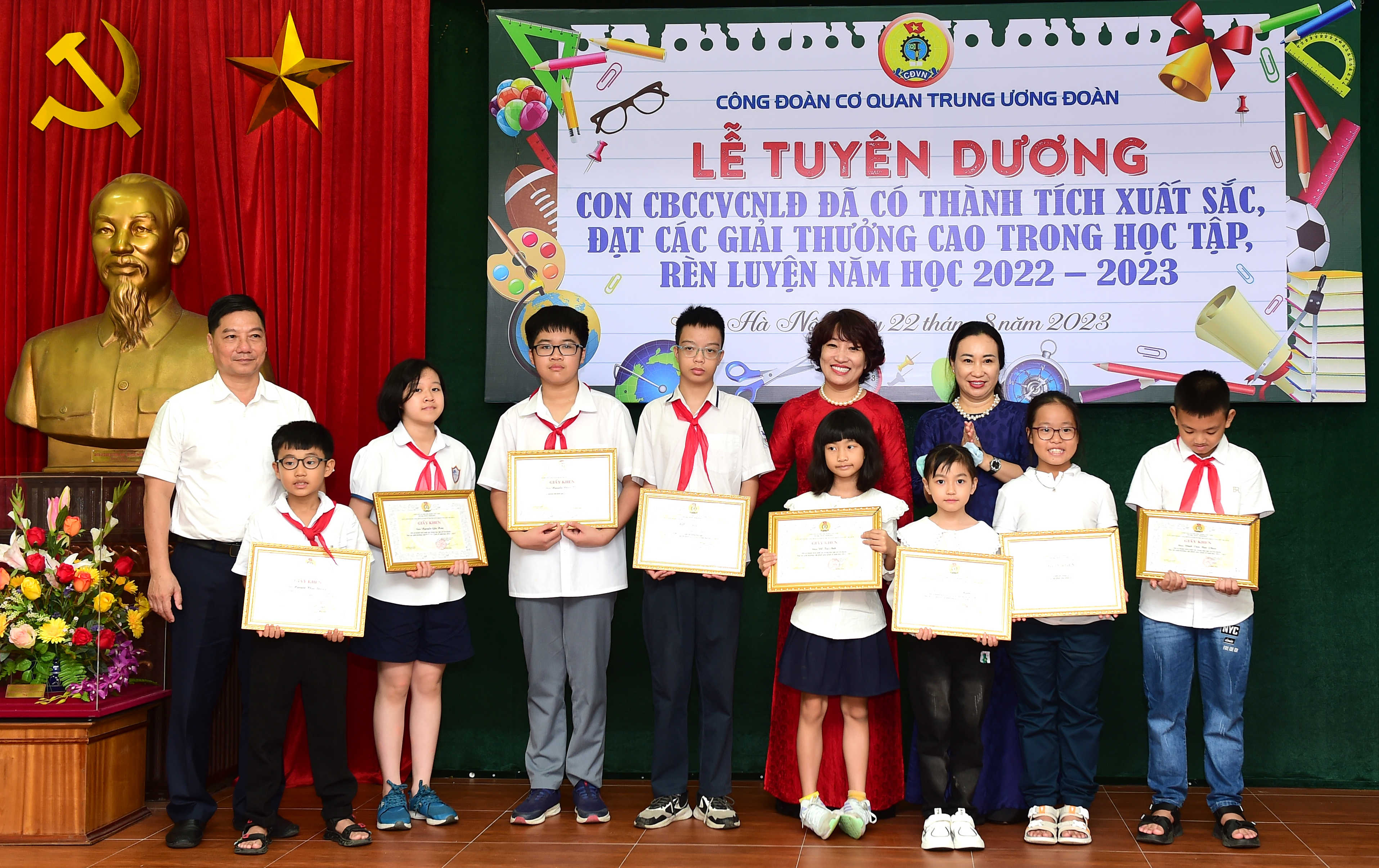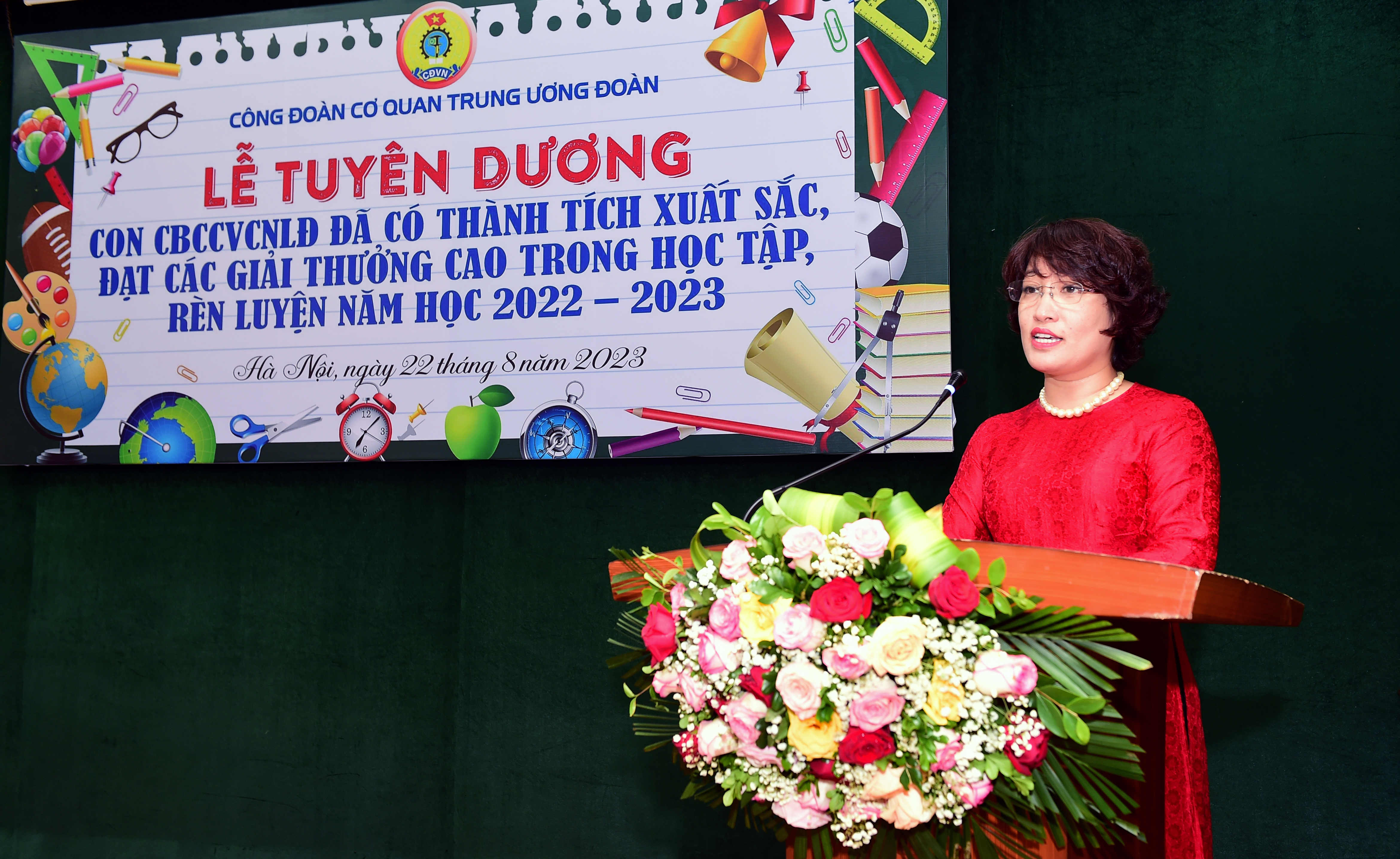 Phát biểu tại buổi lễ, đồng chí Lê Hồng Hạnh, Chủ tịch Công đoàn cơ quan Trung ương Đoàn cho biết: Đây là một trong những hoạt động chăm lo, động viên khích lệ con CBCCVC&NLĐ cơ quan, đồng thời thể hiện sự quan tâm của Công đoàn cơ quan đối với đội ngũ CBCCVC&NLĐ các ban, đơn vị trực thuộc cơ quan Trung ương Đoàn. 56 cháu được tuyên dương đều có thành tích cao trong học tập, rèn luyện năm học 2022-2023, đạt các giải thưởng cao trong các cuộc thi cấp quốc gia, quốc tế và cấp tỉnh, thành phố; trong đó có 18 bạn là học sinh học sinh giỏi và đạt các Giải thưởng cấp Quốc gia, quốc tế, 38 bạn đạt các Giải thưởng cấp tỉnh, Thành phố.