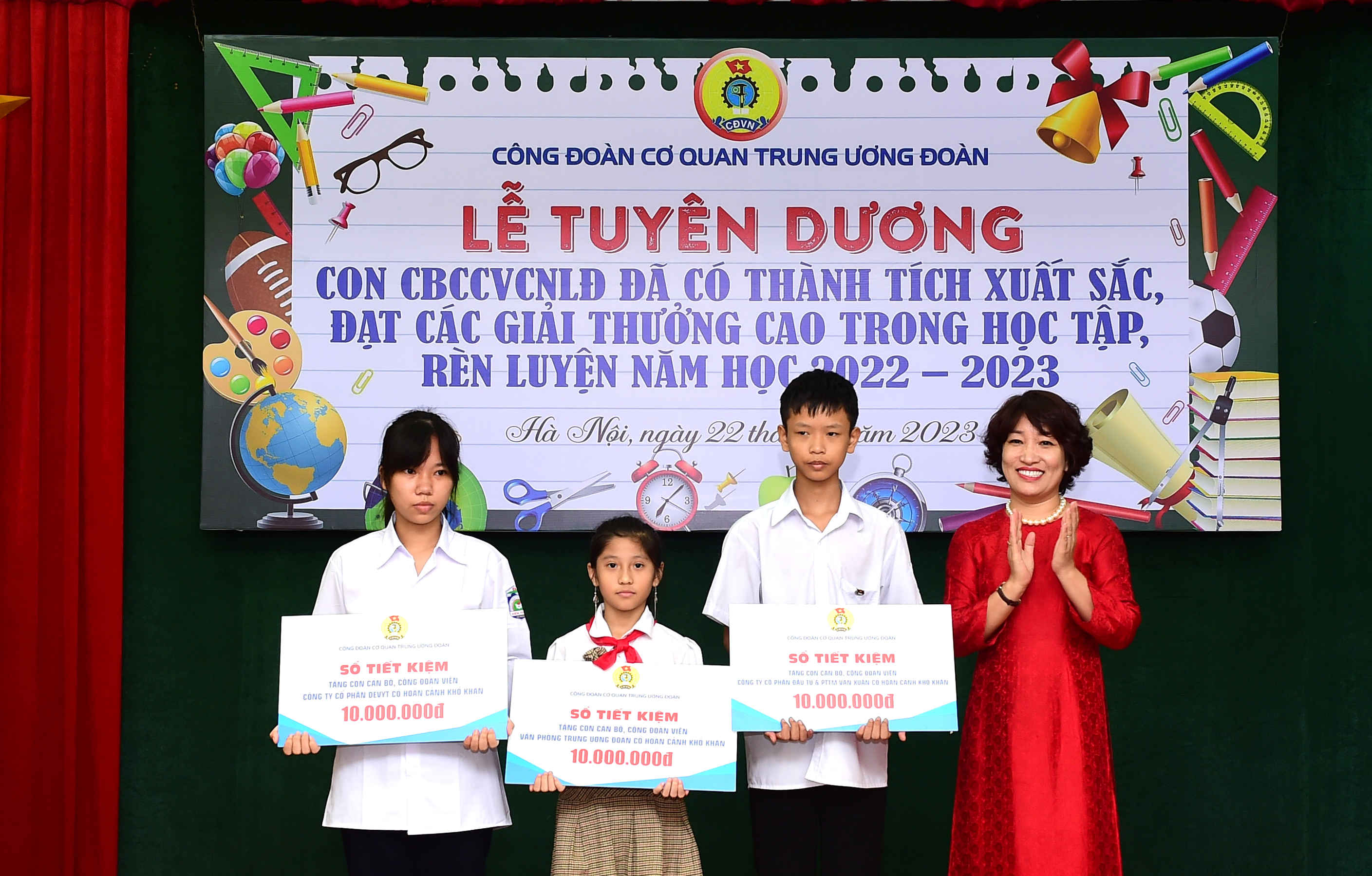 Trong khuôn khổ lễ tuyên dương, Công đoàn cơ quan Trung ương Đoàn, Công đoàn Ban Công tác Thiếu nhi - thường trực Hội Đồng đội Trung ương trao các suất học bổng cho 03 bạn học sinh có hoàn cảnh khó khăn vươn lên trong học tập và rèn luyện năm học 2023.