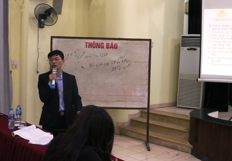 Báo cáo viên Vũ Tuấn Anh - Chuyên viên Ban Chính sách pháp luật và Thi đua khen thưởng Tổng Liên đoàn lao động Việt Nam trao đổi tập huấn tại chương trình.