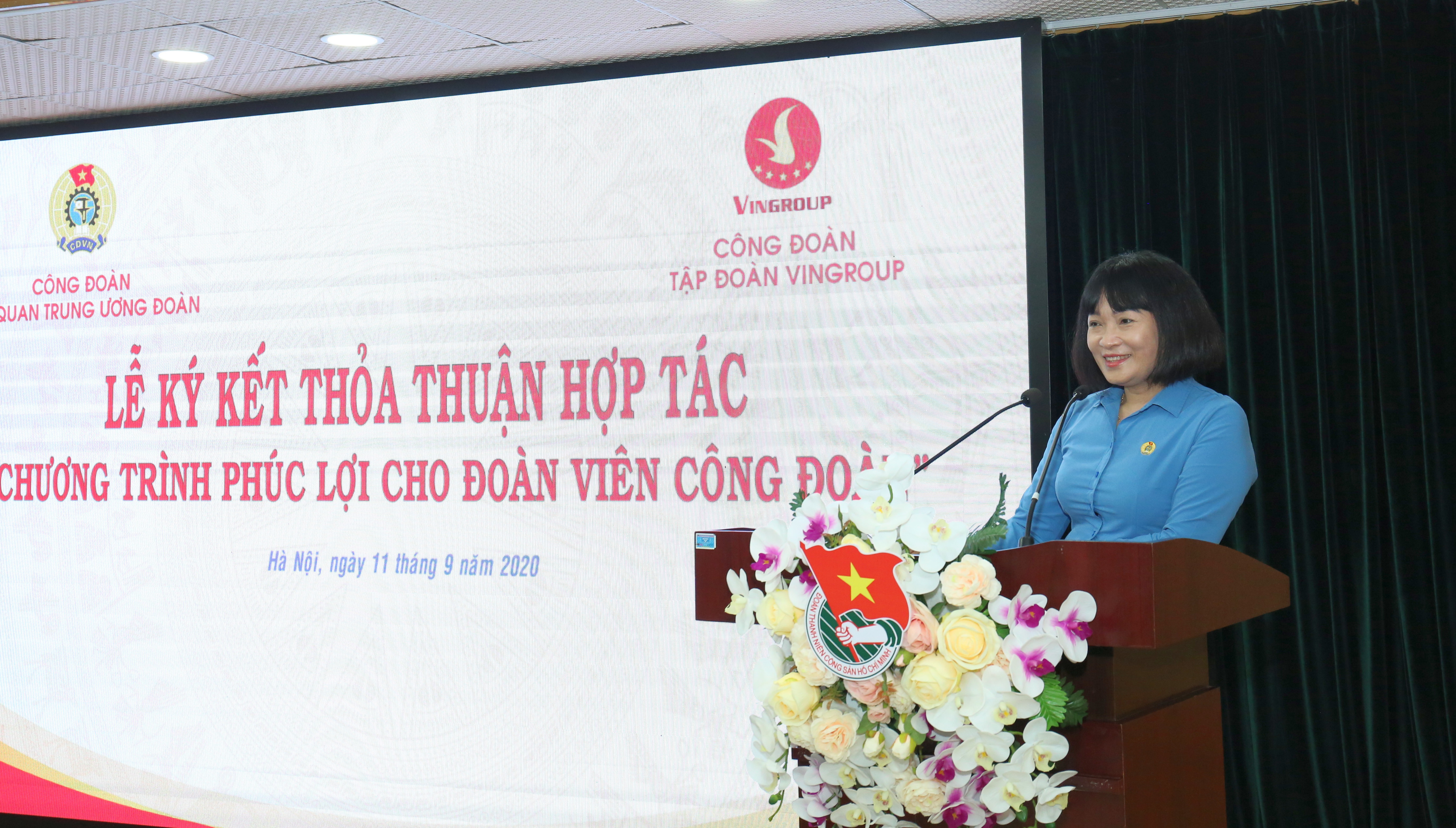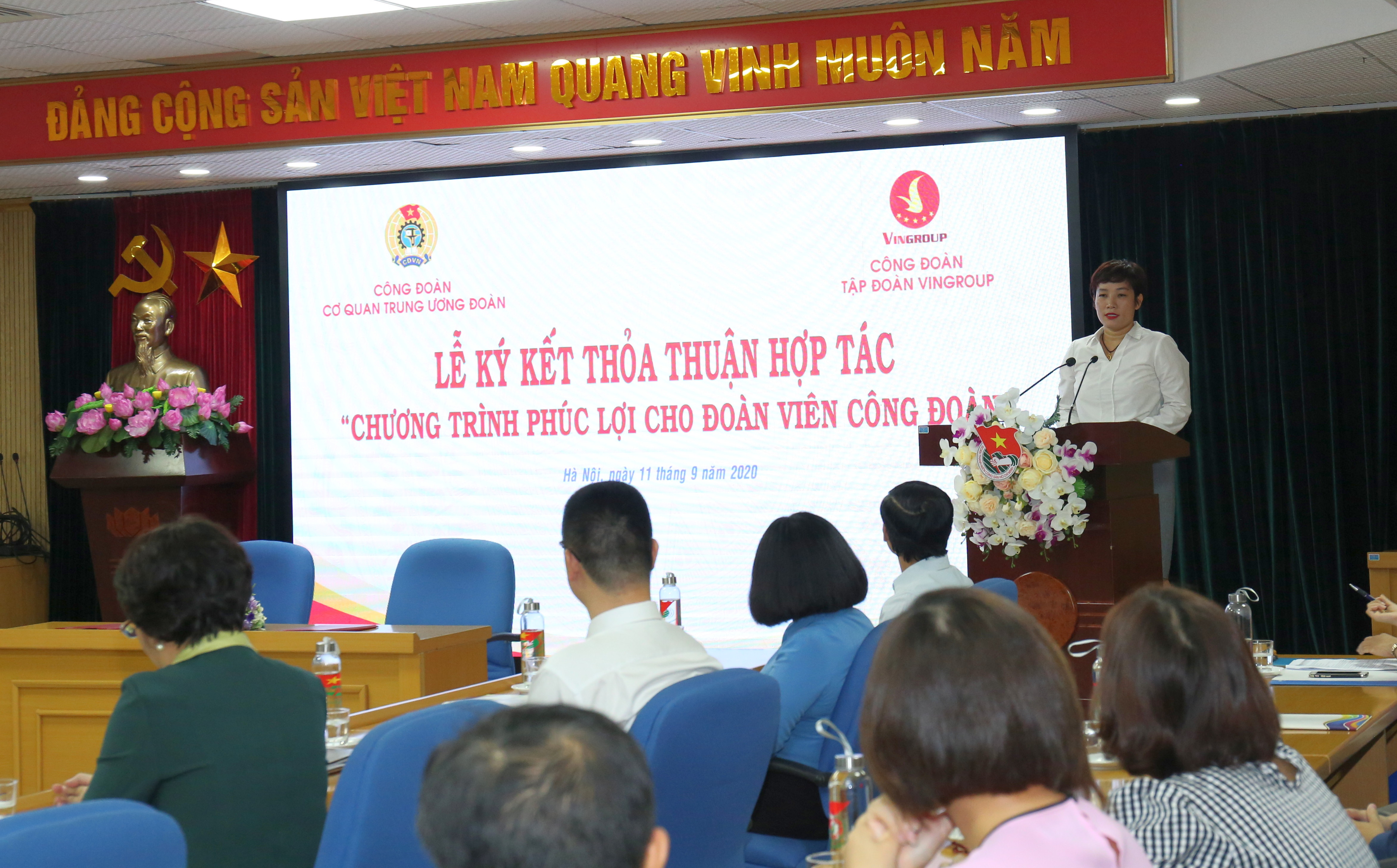 Đồng chí Nguyễn Giang Tuệ Minh, Phó Chủ tịch thường trực Công đoàn Viên chức Việt Nam chúc mừng và đánh giá cao chương trình phúc lợi cho đoàn viên Công đoàn giữa Công Đoàn cơ quan T.Ư Đoàn và Công Đoàn Tập đoàn Vingroup.
