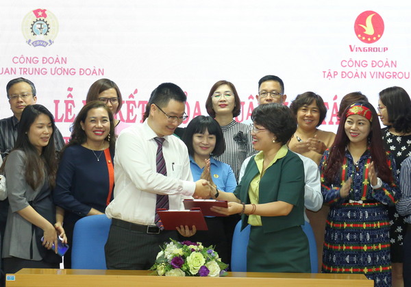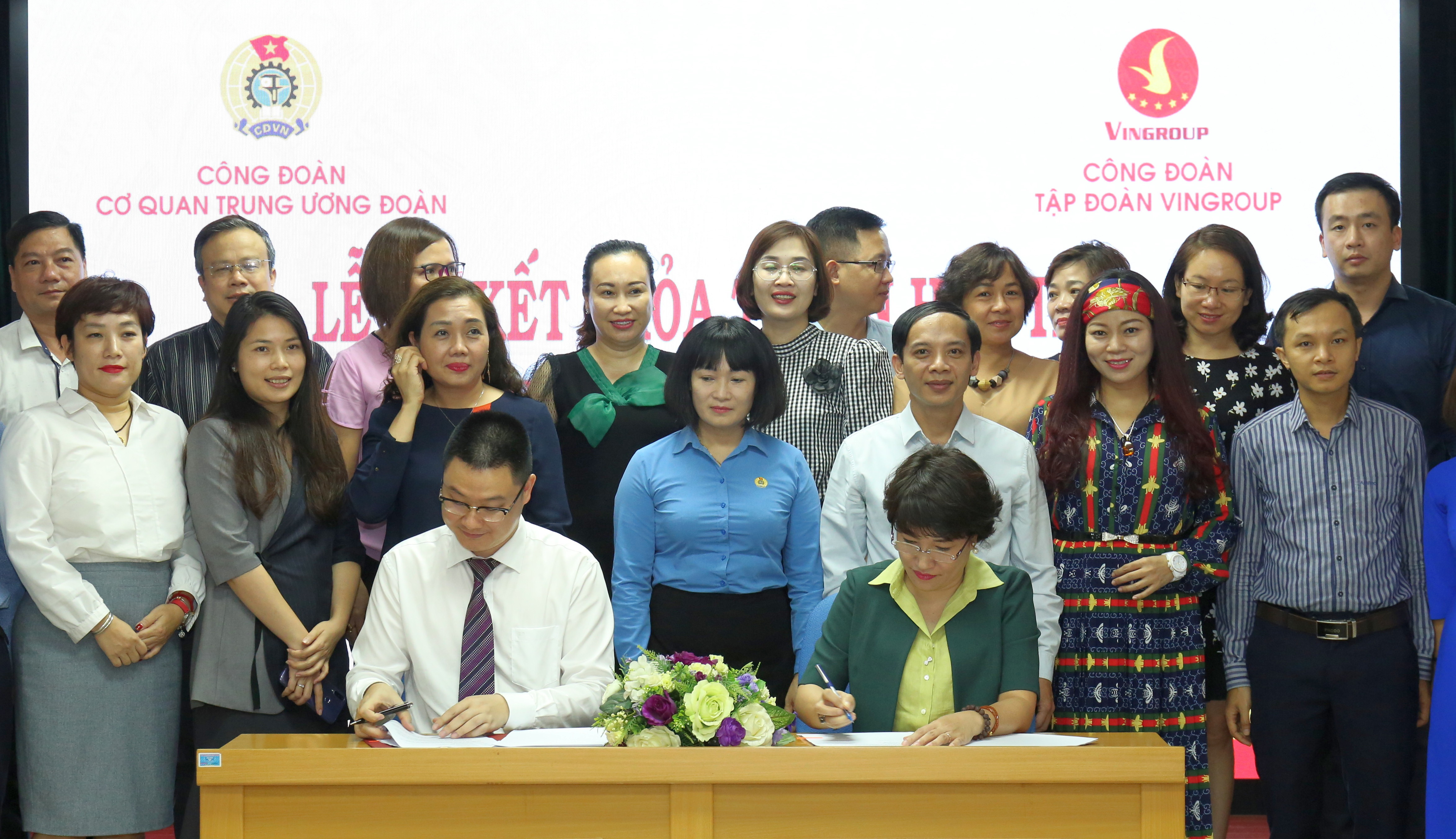 Chủ tịch Công Đoàn cơ quan T.Ư Đoàn Lê Hồng Hạnh và Chủ tịch Công Đoàn Tập đoàn Vingruop Lý Minh Tuấn đã ký thỏa thuận hợp tác