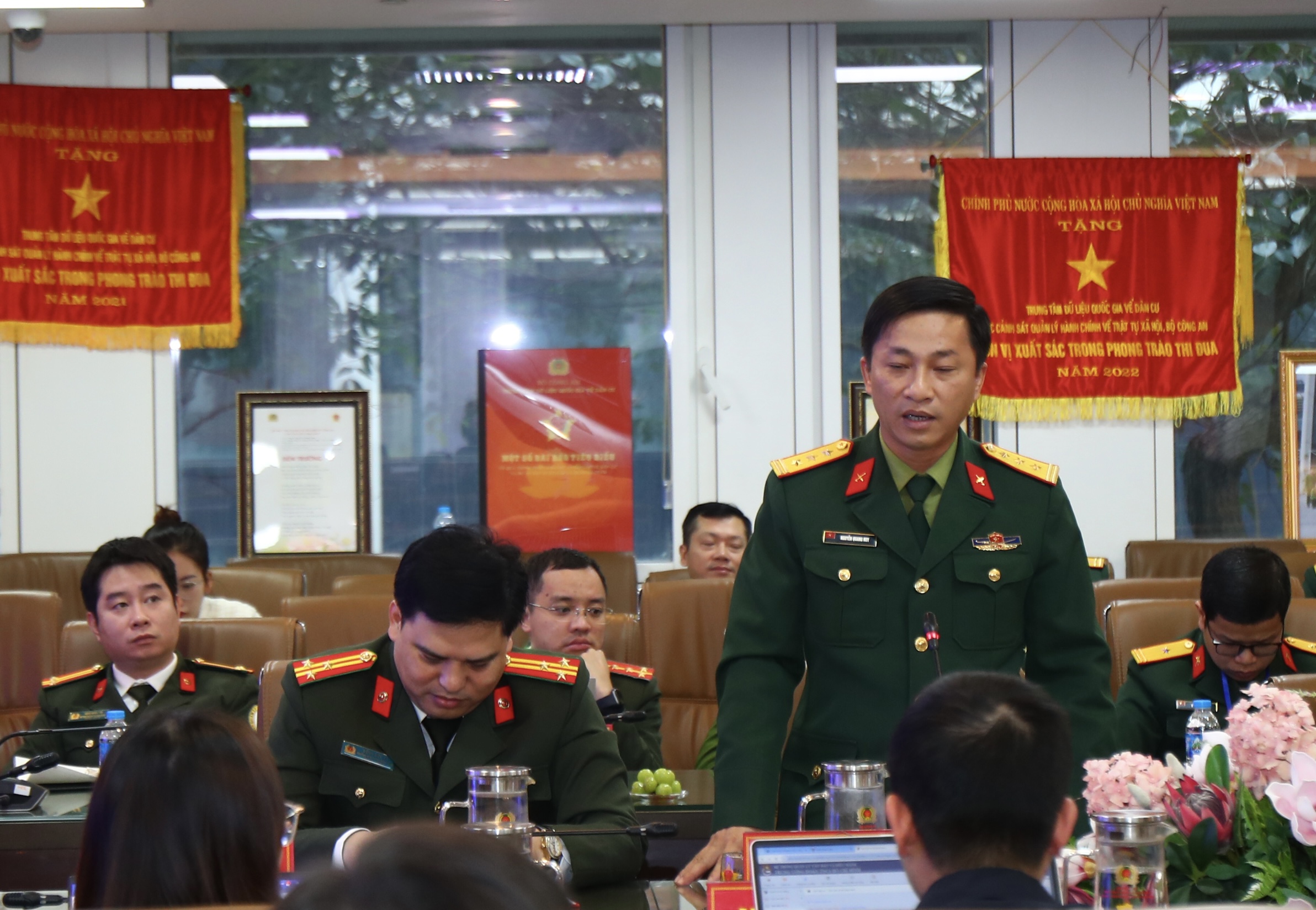 Trung tá Bạch Quốc Tuyên, Phó Trưởng ban Thanh niên Công an Nhân dân phát biểu tại hội nghị