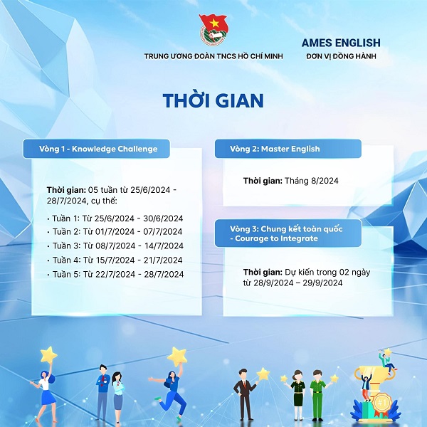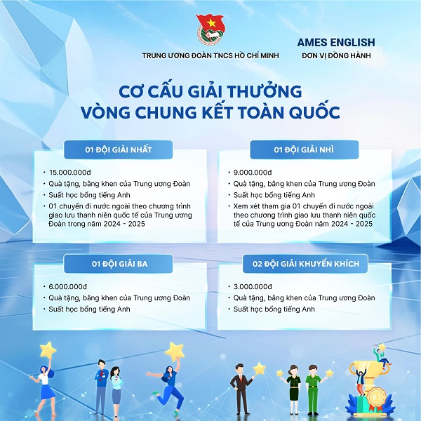 01 đội giải nhất: 15.000.000đ, quà tặng, bằng khen của Trung ương Đoàn, suất học bổng tiếng Anh và 01 chuyến đi nước ngoài theo chương trình giao lưu thanh niên quốc tế của Trung ương Đoàn trong năm 2024 - 2025.