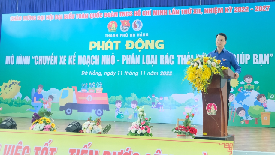 Đồng chí Nguyễn Mạnh Dũng - uỷ viên Ban Chấp hành Trung ương Đoàn, Thành uỷ viên, Bí thư Thành Đoàn Đà Nẵng phát biểu phát động Chương trình "mô hình “Chuyến xe kế hoạch nhỏ - Phân loại rác thải gây quỹ giúp bạn” năm 2022.