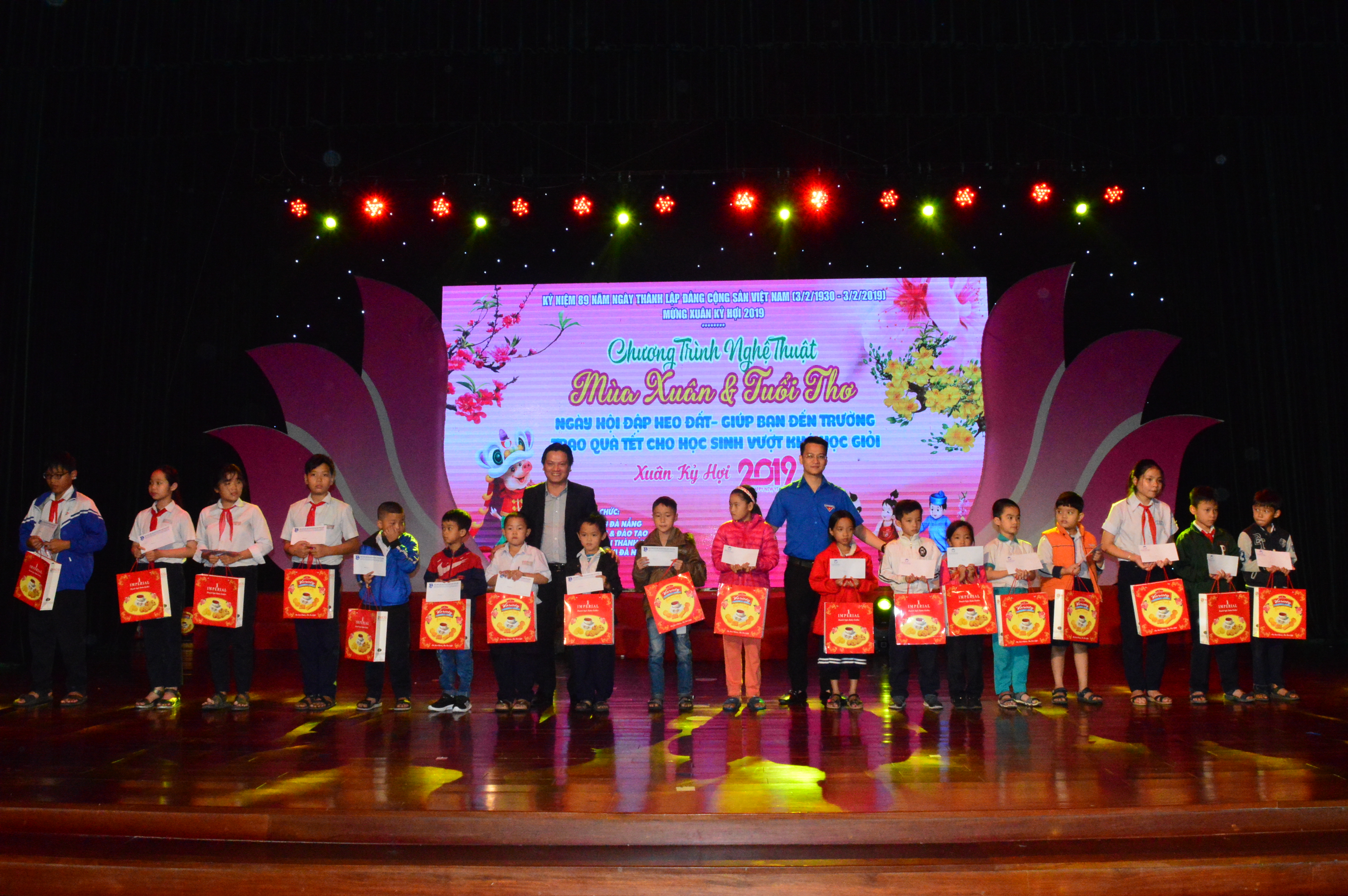 Ban Tổ chức đã tiến hành trao tượng trưng 100 suất quà, mỗi suất trị giá 500.000 đồng cho các em học sinh có hoàn cảnh khó khăn.