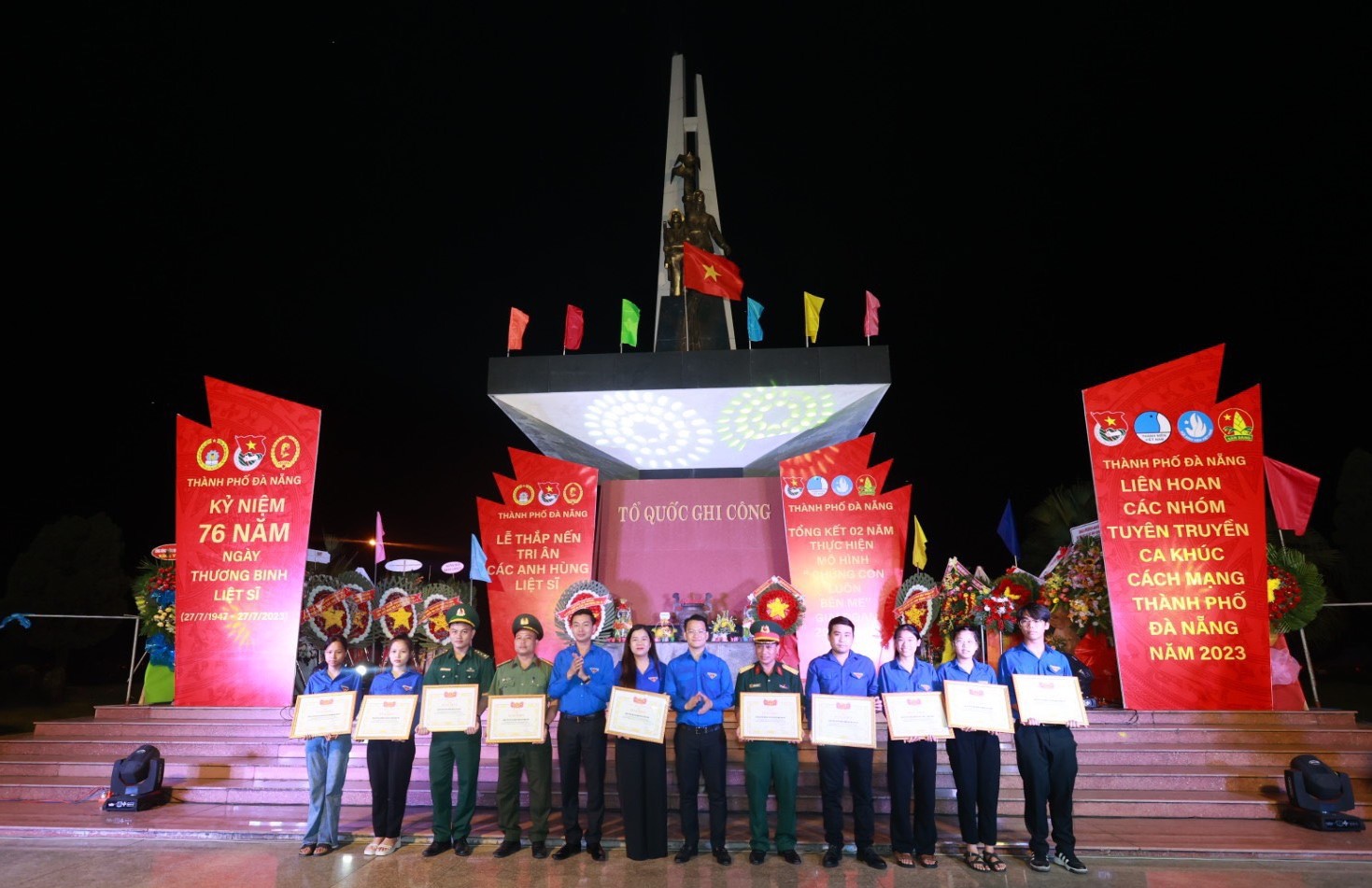 Tối 26/7, tại Nghĩa trang Liệt sĩ thành phố Đà Nẵng, các đồng chí lãnh đạo cùng các bạn đoàn viên, thanh niên đã tiến hành dâng hương, dâng hoa tại Đài tưởng niệm, tại các phần mộ; tổng kết 02 năm thực hiện mô hình “Chúng con luôn bên mẹ” giai đoạn 2021 t 2023; tặng quà cho các mẹ VNAH; tổ chức liên hoan tuyên truyền các ca khúc cách mạng với chủ đề “Tự hào bản hùng ca tuổi trẻ”.
