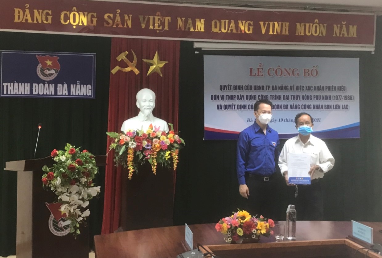 Nhân dịp kỷ niệm 65 năm ngày truyền thống Hội Liên hiệp Thanh niên Việt Nam. Ban Thường vụ Thành Đoàn Đà Nẳng phối hợp với Hội cựu Thanh niên xung phong thành phố tổ chức lễ công bố các Quyết định của Uỷ ban Nhân dân thành phố Đà Nẵng về việc xác nhận phiên hiệu đơn vị Thanh niên Xung phong xây dựng Công trình Đại Thuỷ nông Phú Ninh và quyết định của Thành Đoàn Đà Nẵng về việc công nhận Ban Liên lạc.