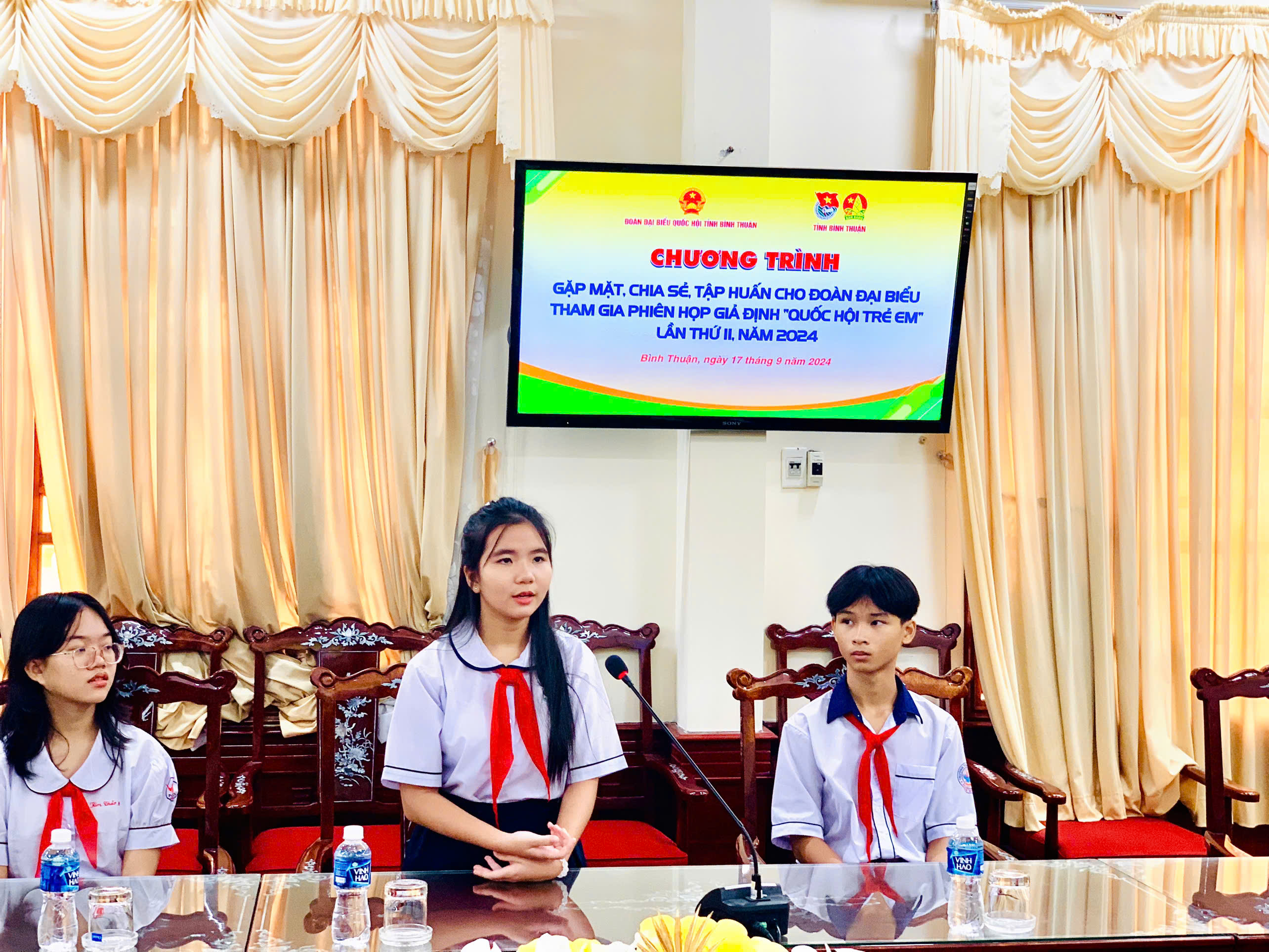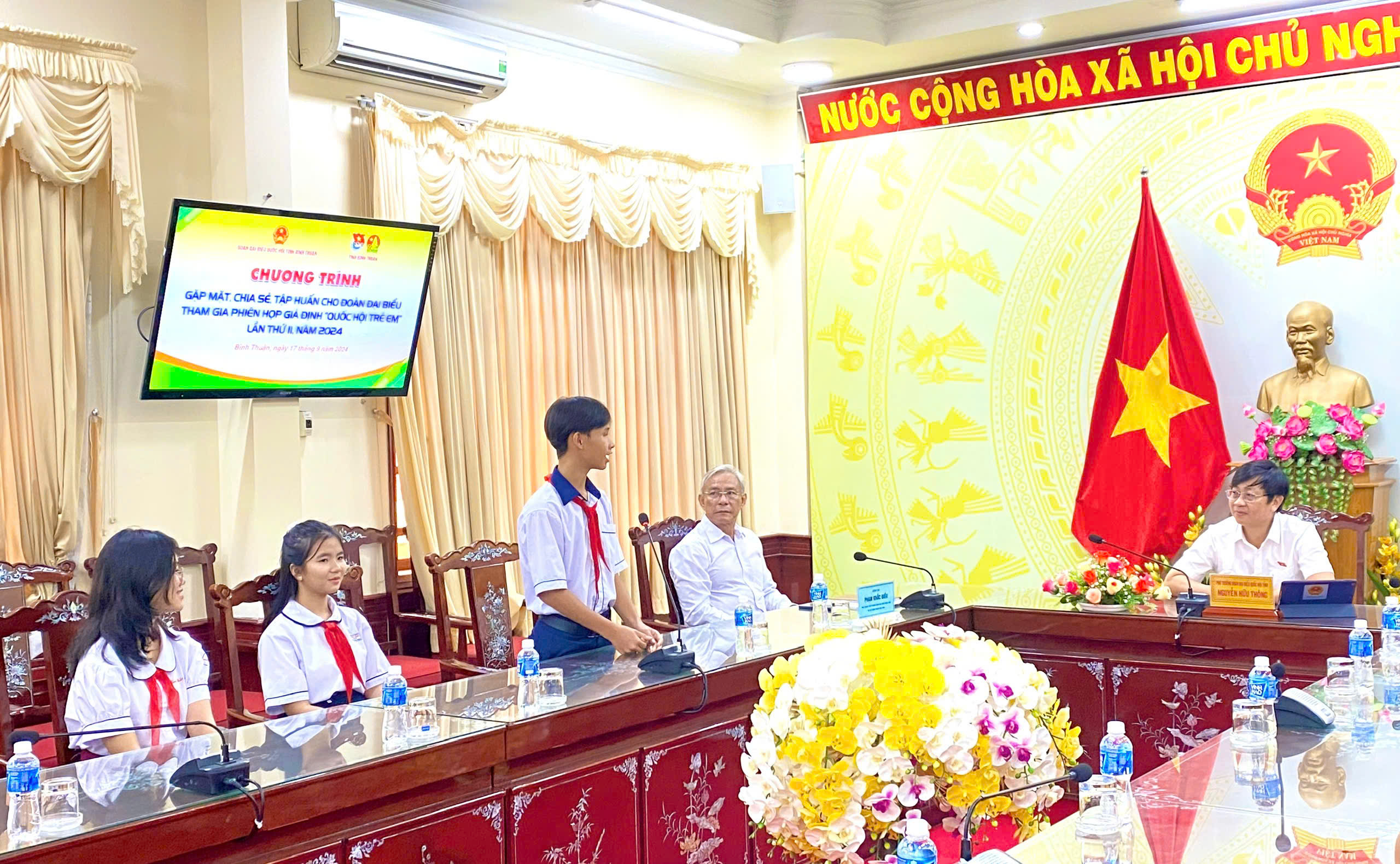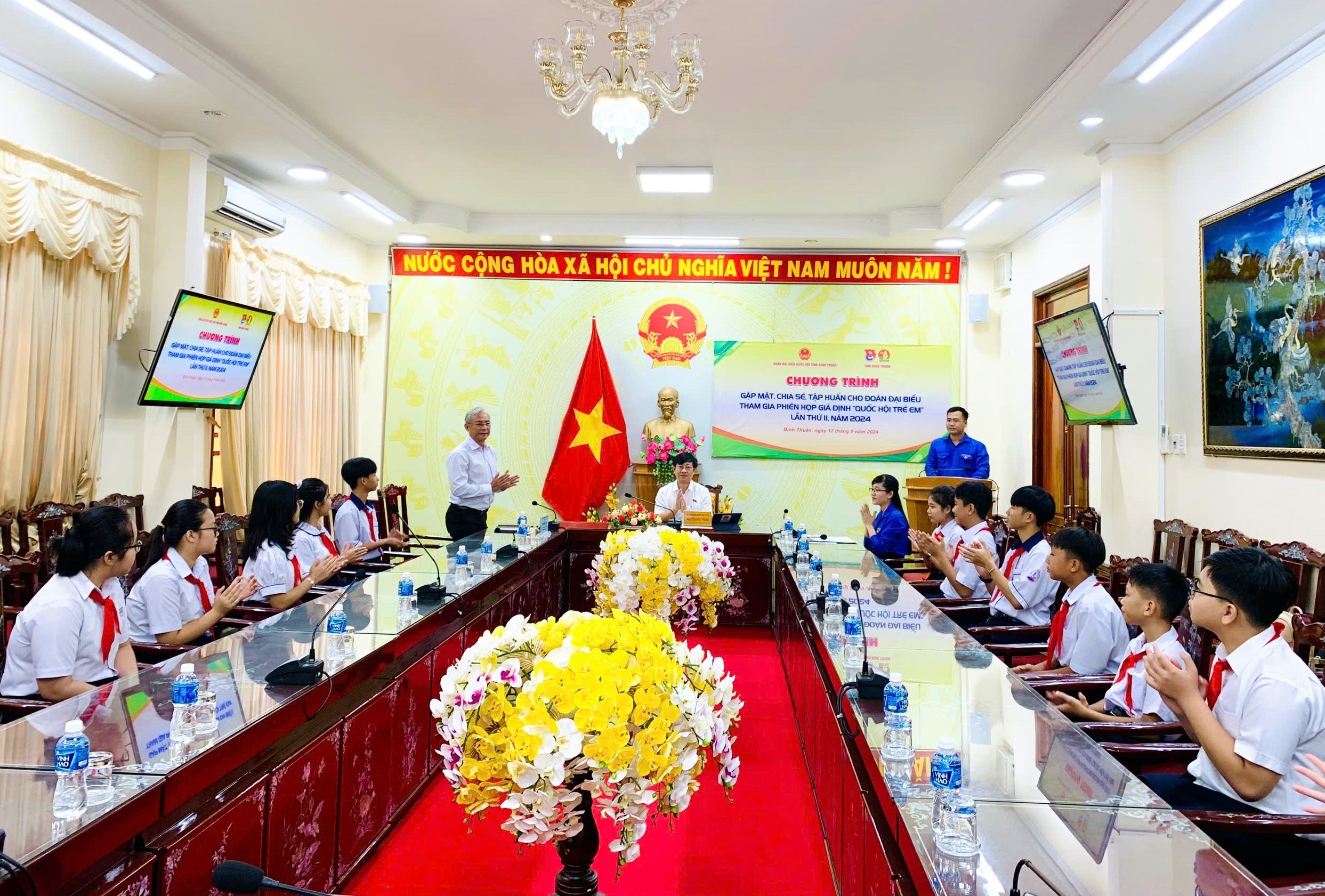 ĐTN: Sáng ngày 17/9/2024, tại Hội trường Văn phòng Đoàn Đại biểu Quốc hội và Hội đồng nhân dân tỉnh Bình Thuận, Ban Thường vụ Tỉnh đoàn, Hội đồng Đội tỉnh phối hợp cùng Đoàn Đại biểu Quốc hội tỉnh Bình Thuận tổ chức buổi gặp mặt, chia sẻ và tập huấn cho đại biểu thiếu nhi trước thềm phiên họp giả định “Quốc hội trẻ em” lần thứ II, năm 2024.