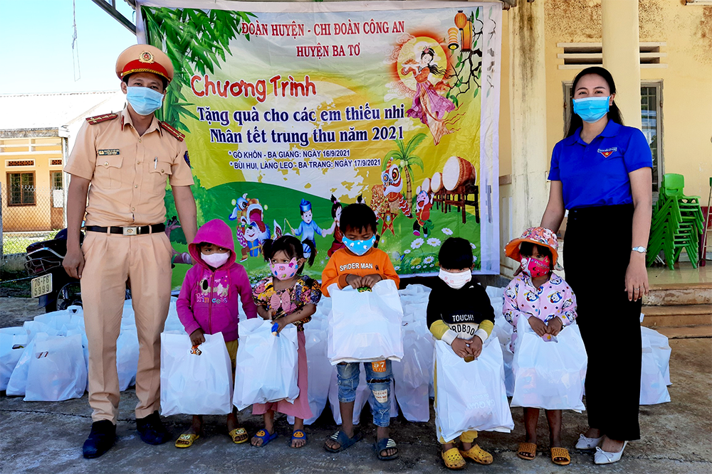 Anh Bão, Bí thư chi đoàn Công an huyện và chị Phạm Thị Chiến, Bí thư Huyện đoàn Ba Tơ tặng quà cho thiếu nhi tại thôn Gò Khôn (xã Ba Giang) và 2 thôn Bùi Hui và Làng Leo (xã Ba Trang). Tổng giá trị của các phần quà là 25 triệu đồng. ẢNh: NVCC