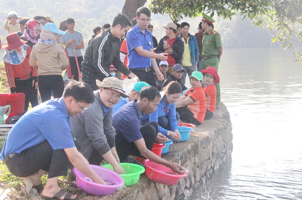 Bà con nhân dân cùng ĐVTN tham gia thả cá giống tạo nguồn thủy sinh |