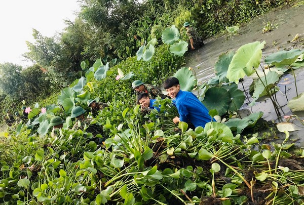 Đoàn viên thanh niên và lực lượng Quân đội đóng quân trên địa bàn tham gia làm sạch kênh mương tại xã Xuân Phú (Yên Dũng).