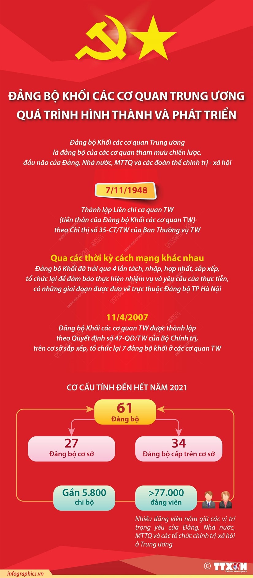 Tính đến hết năm 2021, Đảng bộ Khối bao gồm 61 đảng bộ trực thuộc với 27 đảng bộ cơ sở và 34 đảng bộ cấp trên cơ sở, có gần 5.800 chi bộ với hơn 77.000 đảng viên công tác tại các cơ quan ban đảng, bộ, ngành, tổ chức đoàn thể, hội ở Trung ương./.