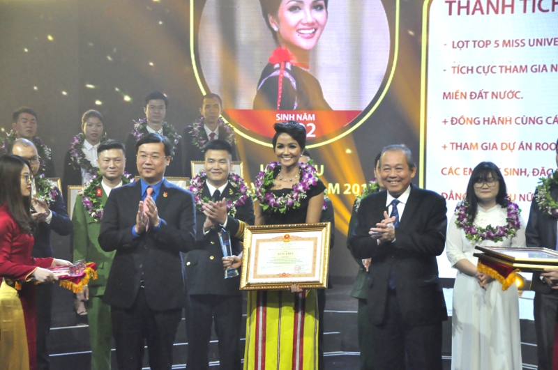 10 Gương mặt trẻ Việt Nam tiêu biểu năm 2018: 1. H’ Hen Niê (Lĩnh vực: Văn hoá – Nghệ thuật) 2. Nguyễn Đức Thành (Lĩnh vực: Nghiên cứu khoa học – Sáng tạo) 3. Vòng Bính Long (Lĩnh vực: Nghiên cứu khoa học – Sáng tạo) 4. Nguyễn Phương Thảo (Lĩnh vực: Học tập) 5. Văn Đinh Hồng Vũ (Lĩnh vực: Kinh doanh – Khởi nghiệp) 6. Trần Văn Thuyết (Lĩnh vực: Lao động sản xuất) 7. Nguyễn Quang Hải (Lĩnh vực: Thể dục thể thao) 8. Nguyễn Văn Thuận (Lĩnh vực: Quốc phòng) 9. Lê Trọng Hiếu (Lĩnh vực: An Ninh trật tự) 10. Lê Đình Hiếu (Lĩnh vực: Hoạt động xã hội) 10 Gương mặt trẻ Việt Nam triển vọng năm 2018 1. Võ Minh Quang (Lĩnh vực: Văn hoá – Nghệ thuật) 2. Đào Tố Loan (Lĩnh vực: Văn hoá – Nghệ thuật) 3. Phạm Đức Anh (Lĩnh vực: Học tập) 4. Hồ Đức Hoàn (Lĩnh vực: Kinh doanh – Khởi nghiệp) 5. Vũ Hoàng Yến (Lĩnh vực: Kinh doanh – Khởi nghiệp) 6. Nguyễn Hải Long (Lĩnh vực: Lao động sản xuất) 7. Trần Đăng Khoa (Lĩnh vực: Lao động sản xuất) 8. Bùi Thị Thu Thảo (Lĩnh vực: Thể dục thể thao) 9. Vàng Lao Lừ (Lĩnh vực: Quốc phòng) 10. Tạ Văn Cường (Lĩnh vực: An ninh trật tự) |