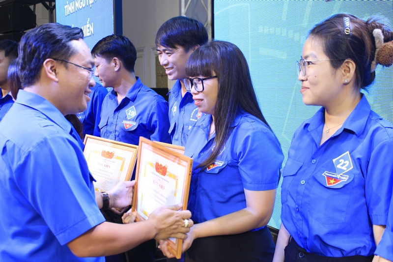 Đồng chí Nguyễn Minh Kiên - Ủy viên BCH Trung ương Đoàn, Bí thư Tỉnh đoàn trao tặng Bằng khen cho các tập thể, cá nhân có thành tích xuất sắc