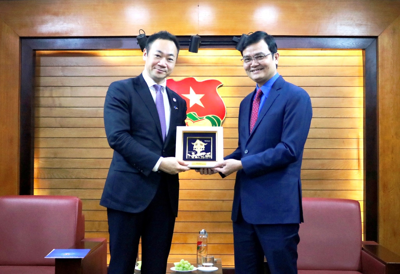 Đồng chí Bùi Quang Huy- Ủy viên Dự khuyết T.Ư Đảng, Bí thư thứ nhất T.Ư Đoàn TNCS Hồ Chí Minh; Chủ nhiệm UBQG về TNVN tặng quà lưu niệm cho ông Suzuki Keisuke, Phó Trưởng Ban Nghiên cứu Chính sách Đảng Dân chủ Tự do Nhật Bản, nguyên Trưởng Ban Thanh niên của Đảng LDP