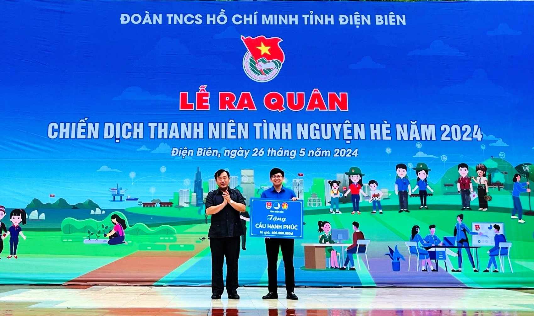 Phó Chủ tịch UBND tỉnh Vừ A Bằng trao biển tượng trưng công trình “Cầu hạnh phúc” cho Huyện đoàn Nậm Pồ.