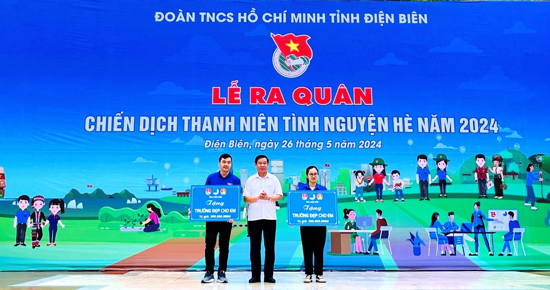 Đồng chí Lò Văn Mừng trao 2 biển tượng trưng công trình “Trường đẹp cho em” cho Huyện đoàn Điện Biên và Huyện đoàn Điện Biên Đông.