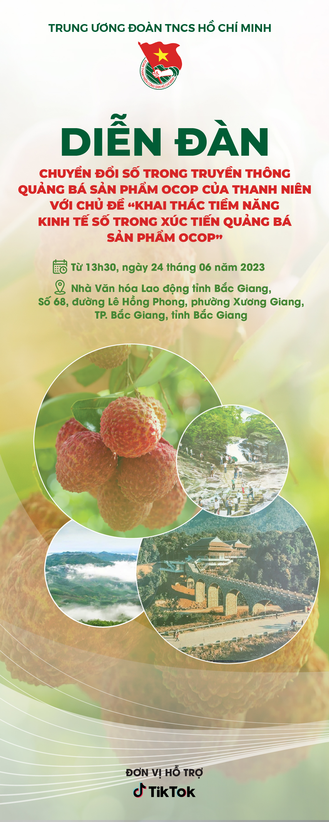 ĐTN: Chương trình Hội nghị Tập huấn Tăng cường kỹ năng quảng bá điểm đến du lịch và bán các sản phẩm OCOP qua phương tiện số cho thanh niên nông thôn và Diễn đàn Chuyển đổi số trong truyền thông quảng bá sản phẩm OCOP của thanh niên với chủ đề “Khai thác tiềm năng kinh tế số trong xúc tiến quảng bá sản phẩm OCOP” sẽ diễn ra vào 24/6 tại Bắc Giang.