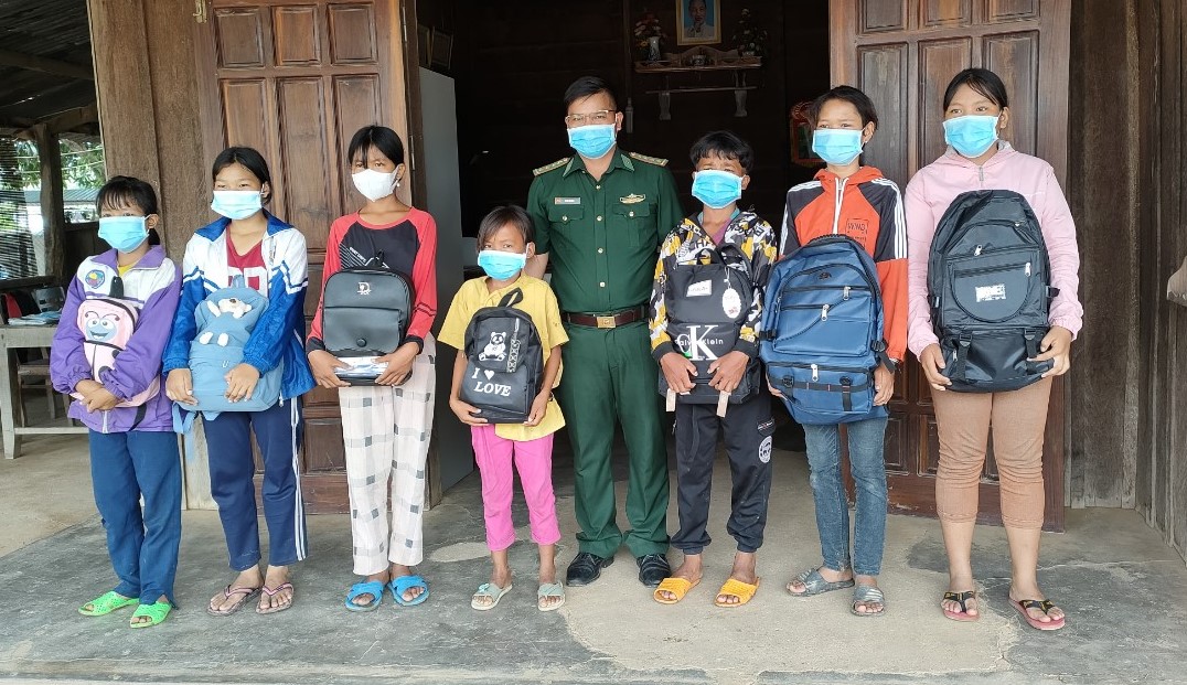 Đại úy Đinh ƠRing tặng quà cho các em thiếu nhi có hoàn cảnh khó khăn