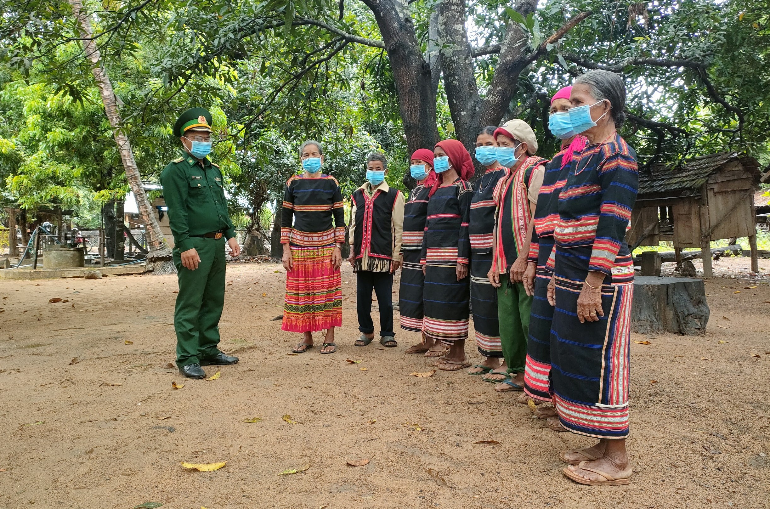 Đại úy Đinh ƠRing đang tuyên truyền với bà con dân tộc thiểu số về phòng chống dịch bệnh COVID-19