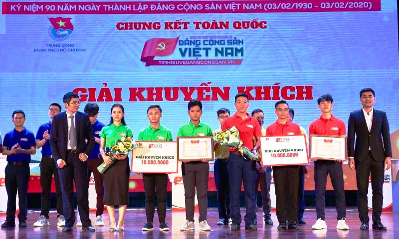 Nguyễn Hoài Nam (áo đỏ, thứ 3 từ phải sang) nhận giải trong cuộc thi trực tuyến tìm hiểu về Đảng Cộng sản Việt Nam