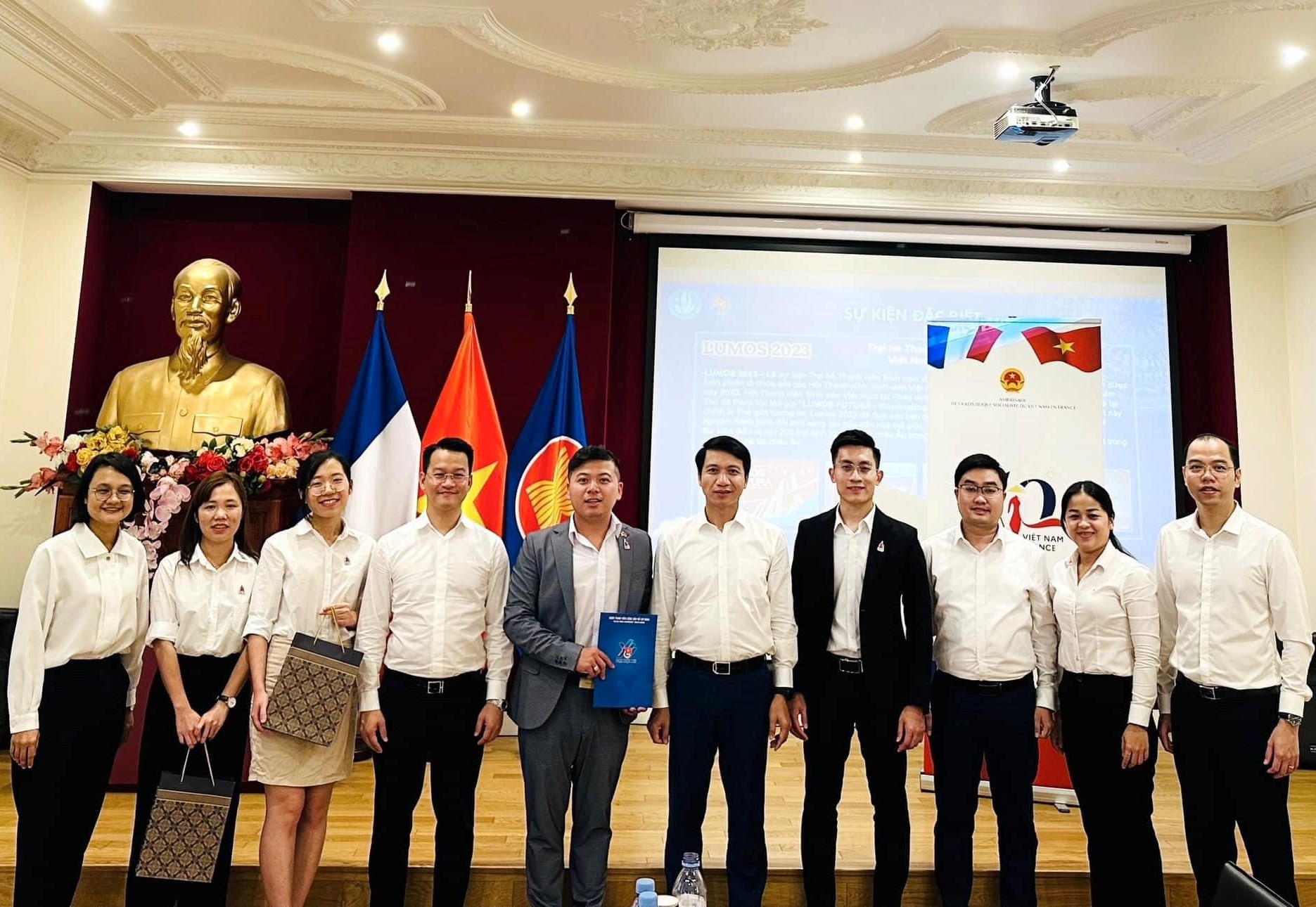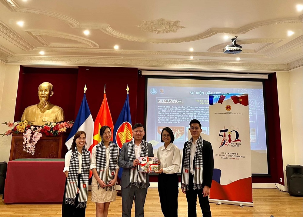 Đồng chí Nguyễn Ngọc Lương, Bí thư Thường trực Trung ương Đoàn, Chủ tịch Trung ương Hội Liên hiệp Thanh niên Việt Nam cùng đoàn công tác trao tặng quà cho Hội Sinh viên Việt Nam tại Pháp