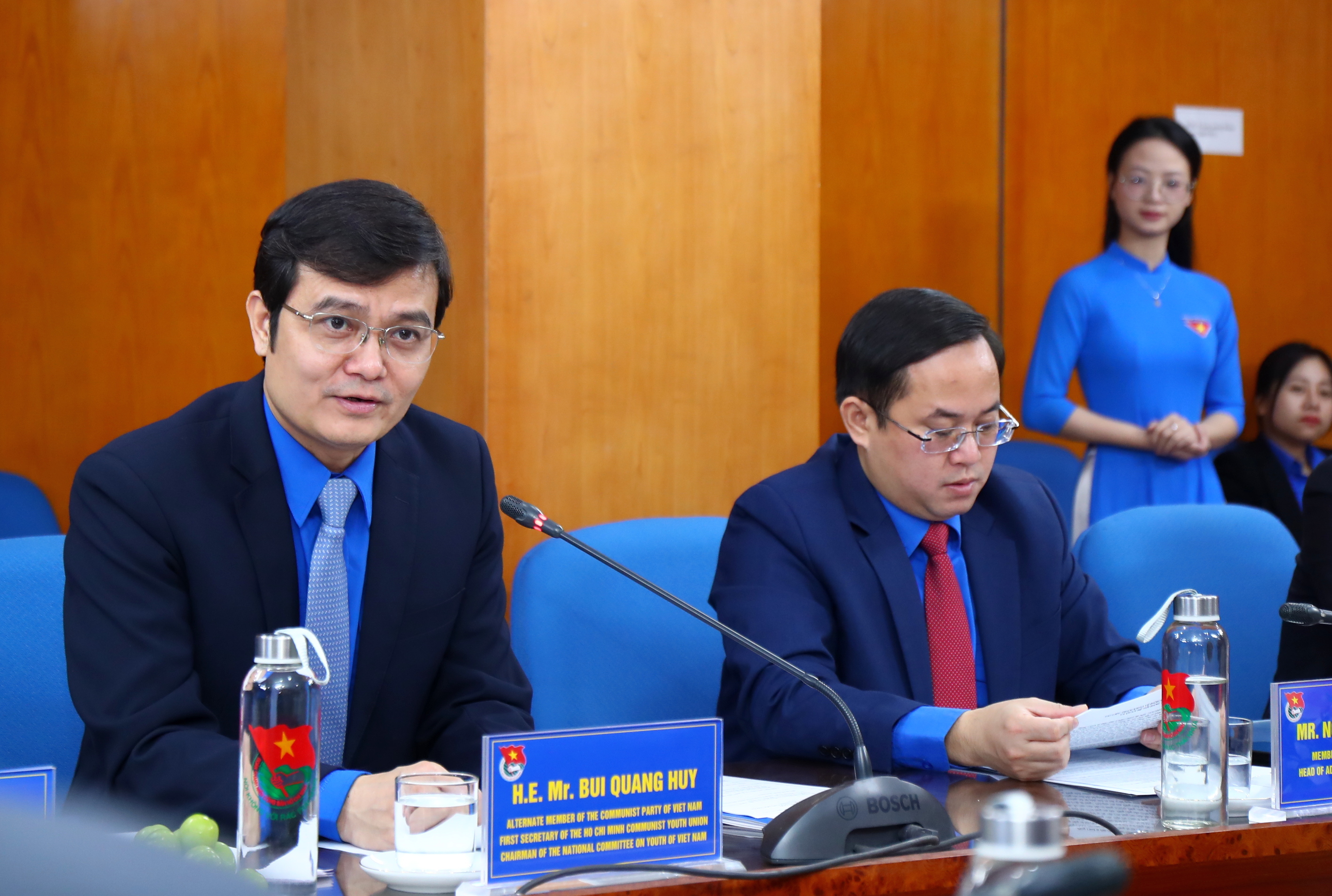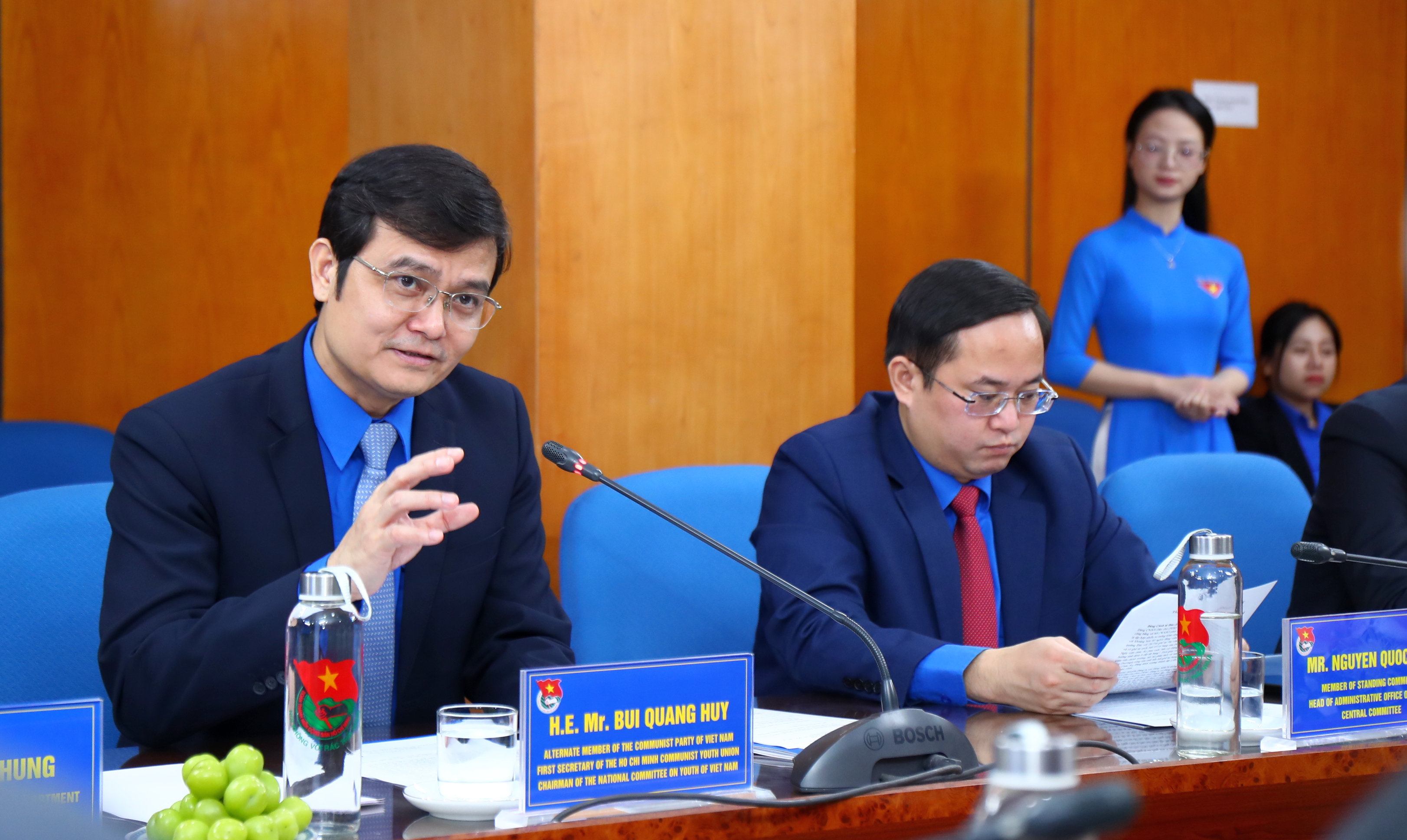 Đồng chí Bùi Quang Huy, Ủy viên dự khuyết BCH Trung ương Đảng, Bí thư thứ nhất BCH Trung ương Đoàn, Chủ nhiệm Ủy ban quốc gia về thanh niên Việt Nam phát biểu tại buổi làm việc