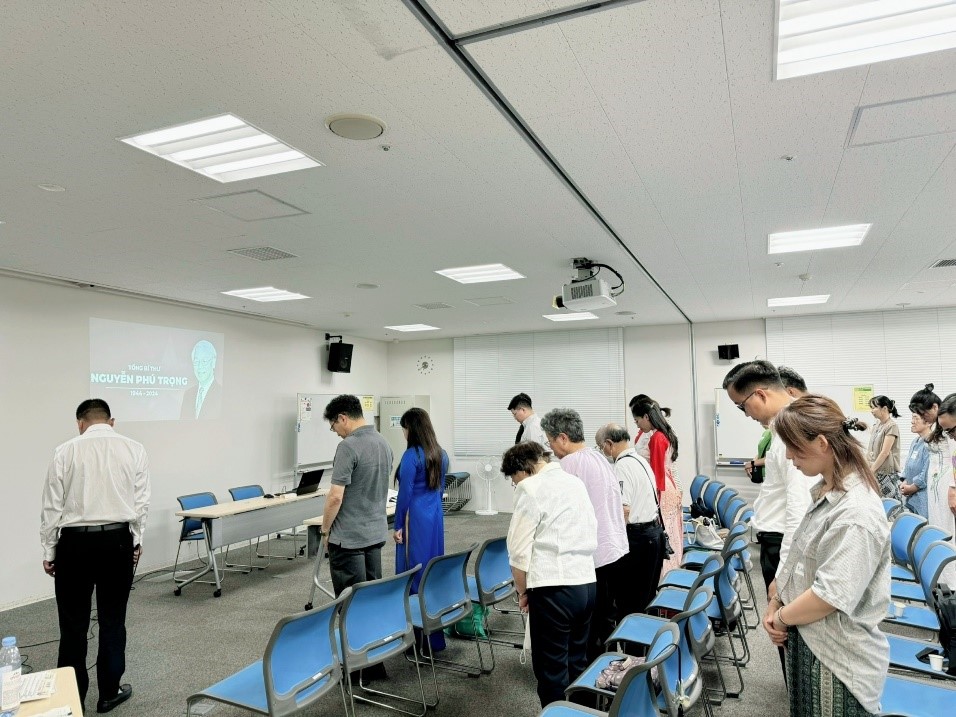 Đoàn đại biểu thanh niên Việt Nam và người dân của thành phố Aizuwakamatsu, tỉnh Fukushima, Nhật Bản dành một phút tưởng niệm Đồng chí Tổng Bí thư Nguyễn Phú Trọng.