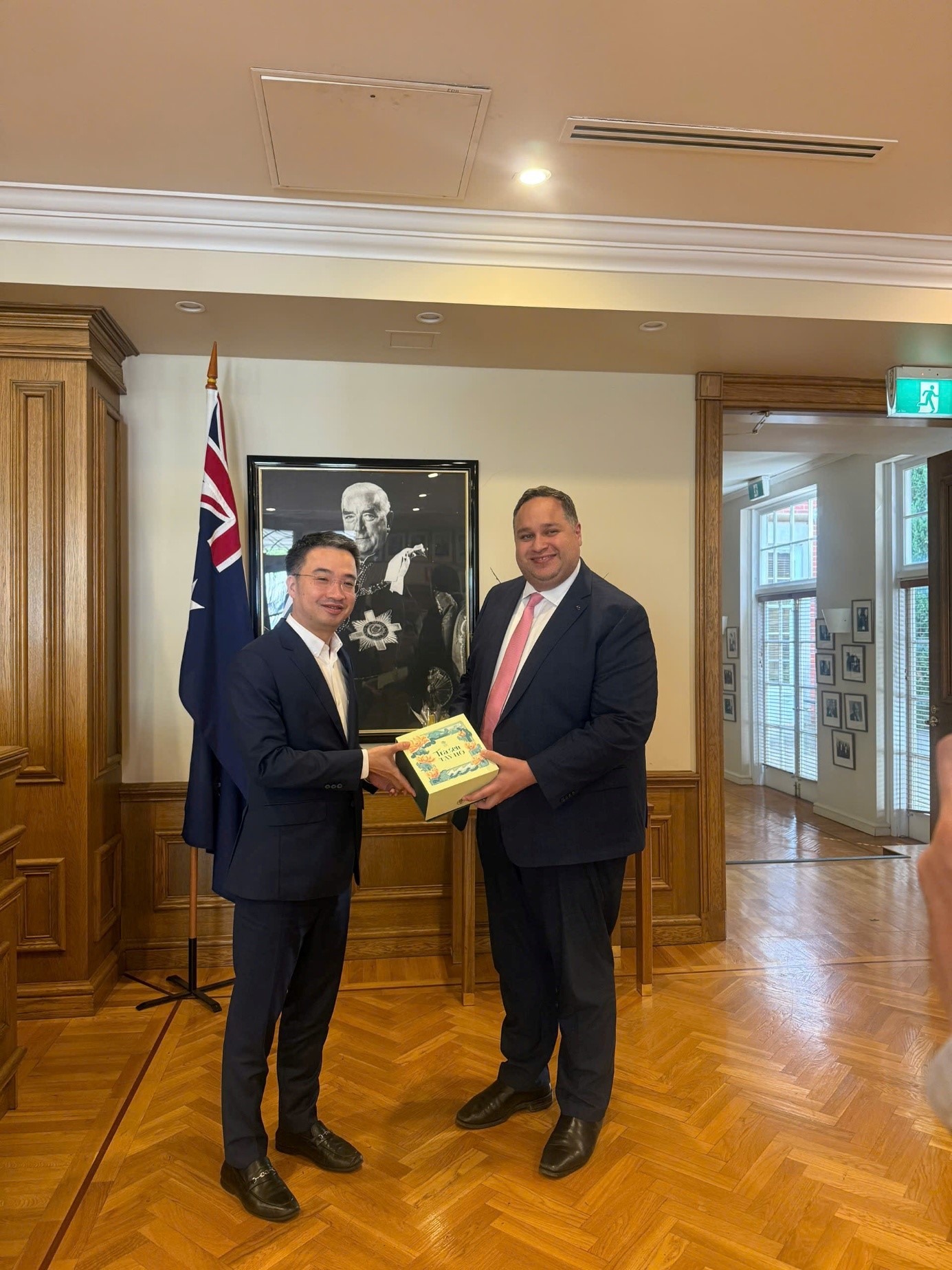 Đồng chí Nguyễn Tường Lâm- Bí thư Trung ương Đoàn, Trưởng đoàn đại biểu trao đổi quà với Lãnh đạo Đảng Tự do Australia