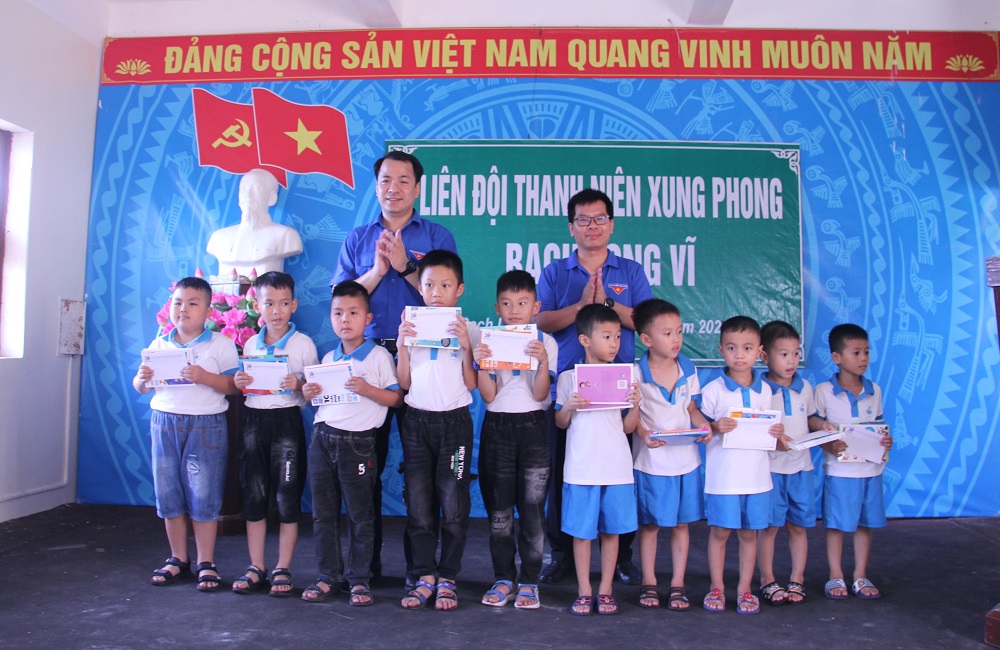 Bí thư T.Ư Đoàn Ngô Văn Cương và Trưởng Ban TNXP T.Ư Đoàn Lê Thanh Tú tặng quà cho các em thiếu nhi