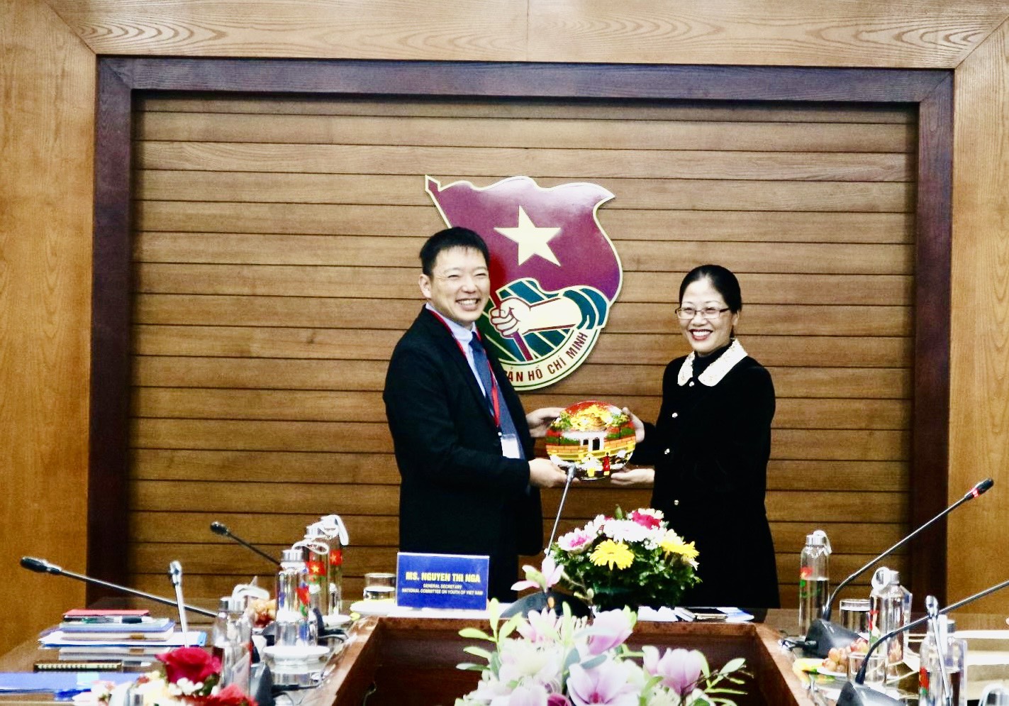 Đồng chí Nguyễn Thị Ngà, Tổng Thư ký Ủy ban Quốc gia về Thanh niên Việt Nam trao tặng quà cho ông Nakagawa Junichi- Phó hiệu trưởng trường THPT Sumiyoshi, Trưởng đoàn đại biểu