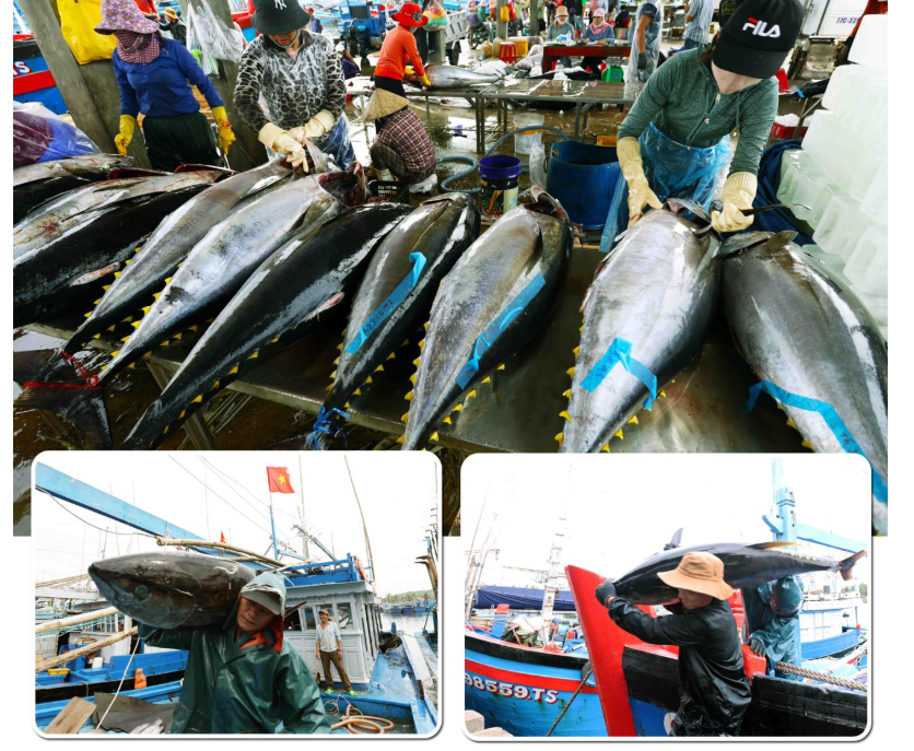 Ngư dân Bình Định vận chuyển cá ngừ đại dương ở cảng cá Tam Quan, thị xã Hoài Nhơn.