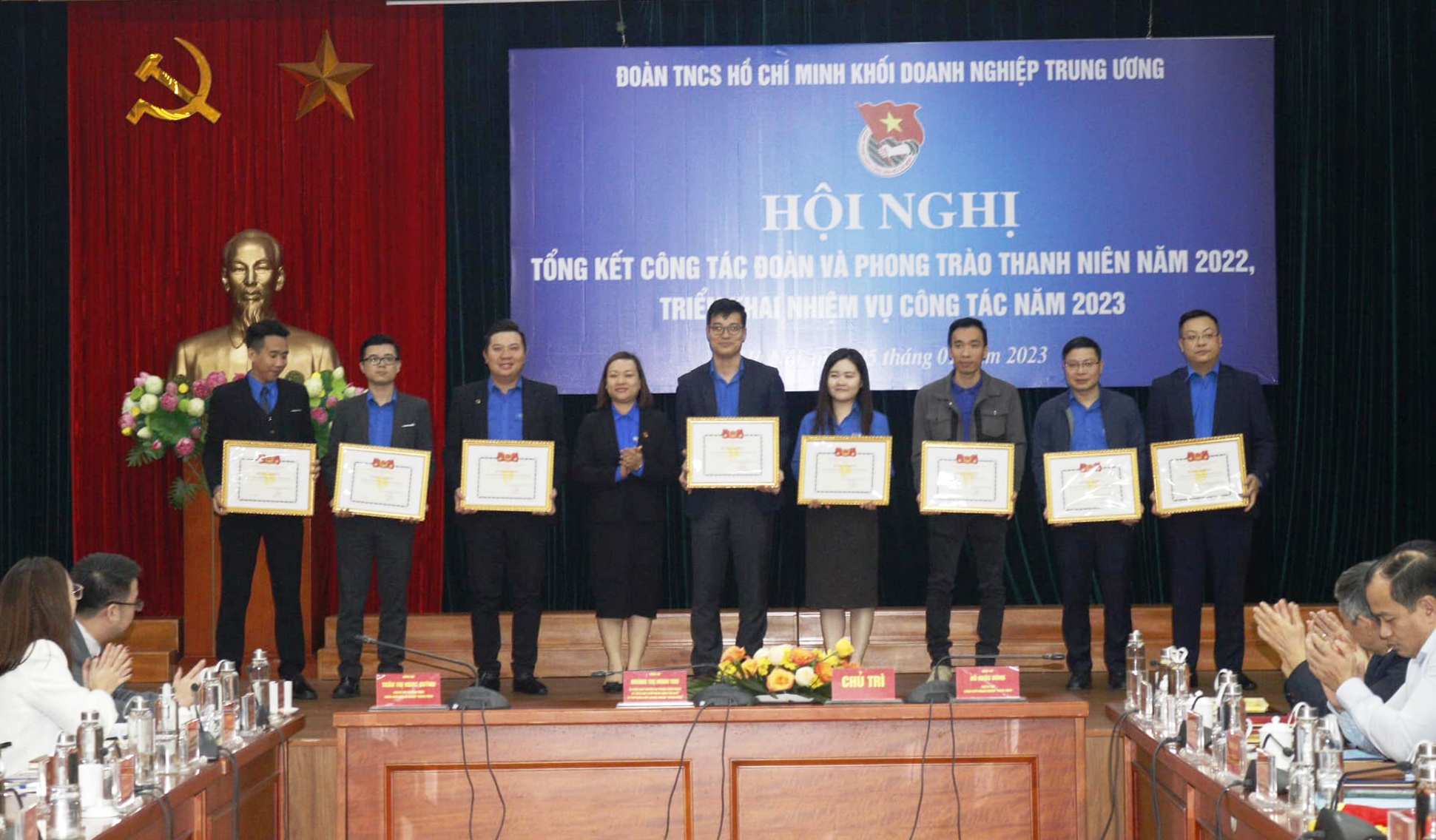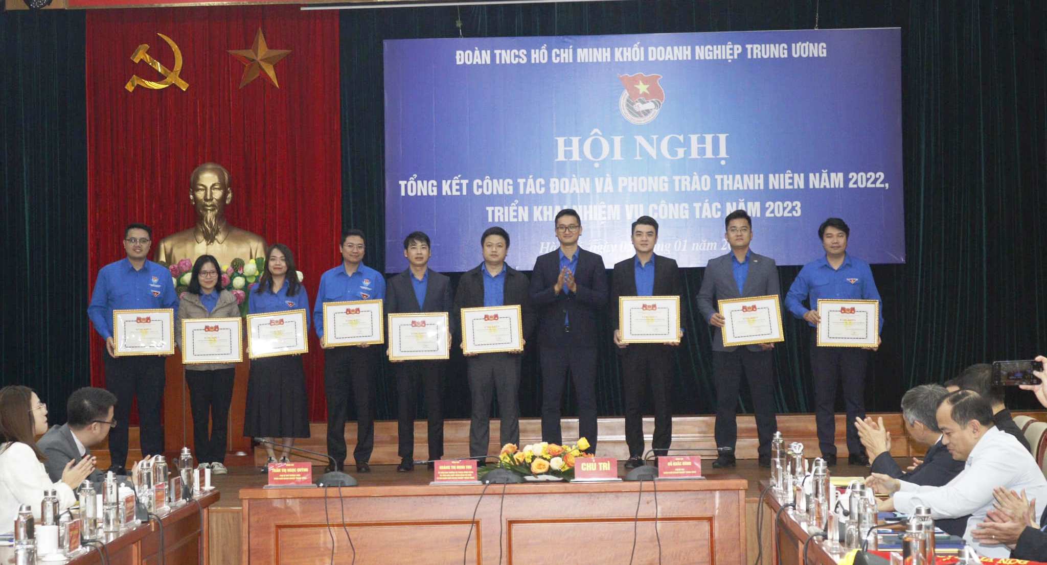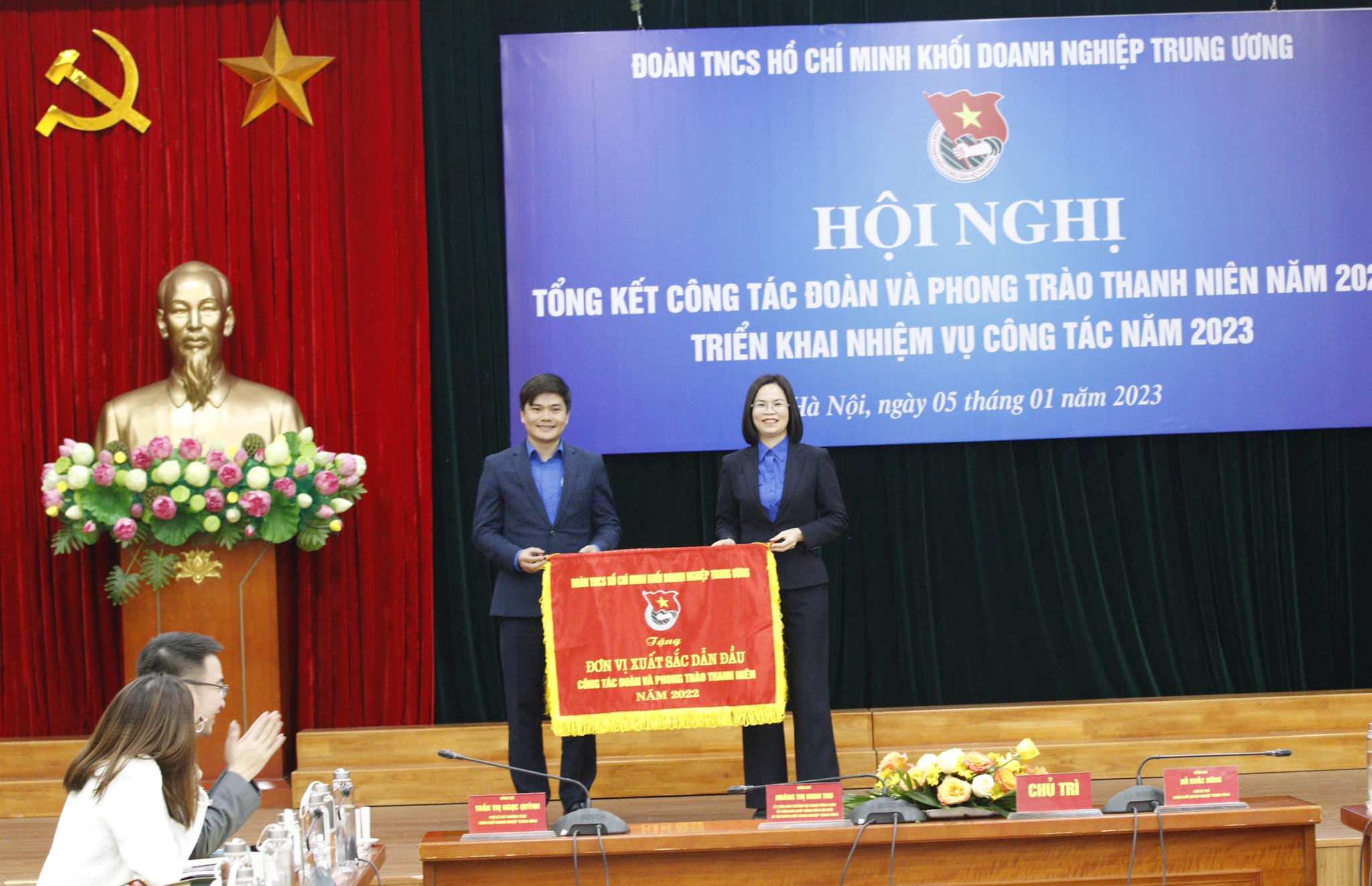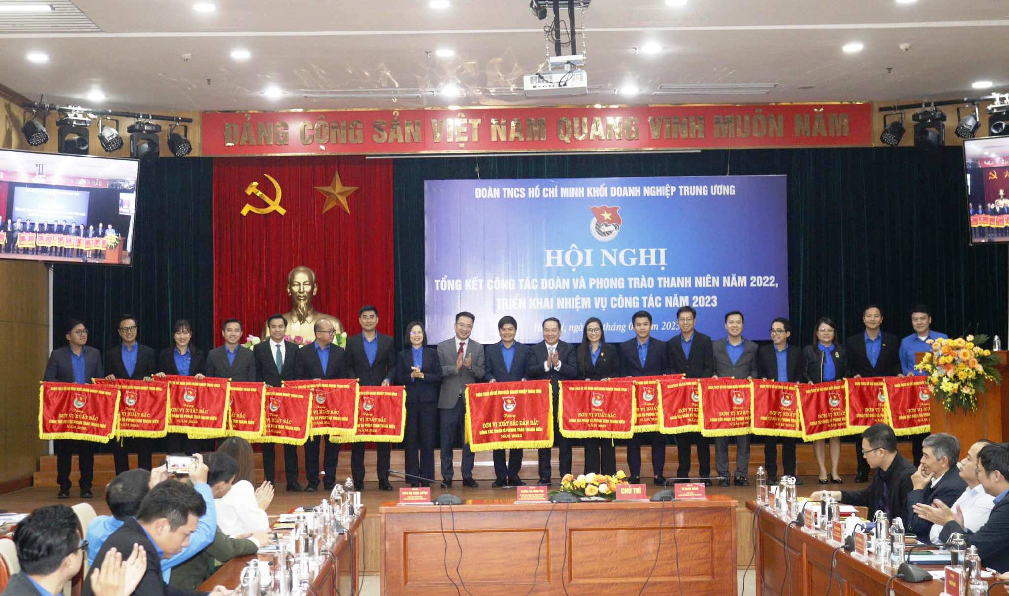 Đồng chí Nguyễn Tường Lâm - Bí thư BCH Trung ương Đoàn và đồng chí Hoàng Thị Minh Thu- Bí thư Đoàn Khối Doanh nghiệp T.Ư trao tặng cờ cho 16 tập thể xếp loại xuất sắc trong công tác Đoàn và phong trào thanh niên năm 2022
