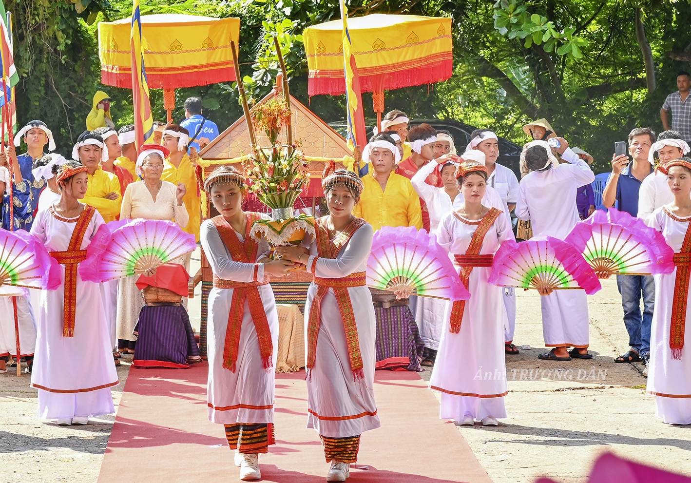 Các vị chức sắc cùng thế hệ trẻ của đồng bào Chăm dẫn đoàn kiệu rước y trang vua Pô Klong Garai ( (vị vua có công lao to lớn với đồng bào Chăm)