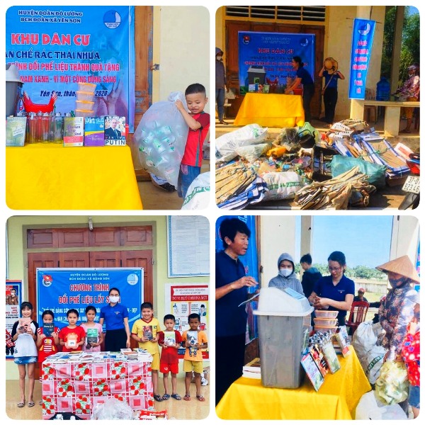 “Đổi phế liệu lấy tri thức”, “Đổi phế liệu lấy quà tặng”, “Để trường mình sạch sẽ thêm xanh”, …là những chương trình, hoạt động thiết thực được tổ chức tại các khu vực dân cư, thu hút đông đảo đoàn viên, thanh niên, nhiếu nhi đến tham gia . Kết quả đã thu về gần 5.000 lon bia, chai nhựa, 3.650 kg giấy loại, đổi được hàng trăm quyển sách truyện cho cán bộ, Đội viên, phát tặng nhiều bình thủy tinh, làn nhựa cho bà con nhân dân sử dụng trong sinh hoạt thay thế túi nilon. Ngoài ra, các cơ sở còn đẩy mạnh tuyên truyền, thực hiện mô hình “Tái chế lốp xe ô tô thành thùng rác”, thiết kế các thùng rác với những câu nói “Hãy cho tôi rác” ,“Anh vô cơ, em hữu cơ” ngộ nghĩnh, hóm hỉnh, được đặt tại các điểm dân cư trên địa bàn, thu hút sự chú ý của người dân, hạn chế hành động vứt rác bừa bãi.