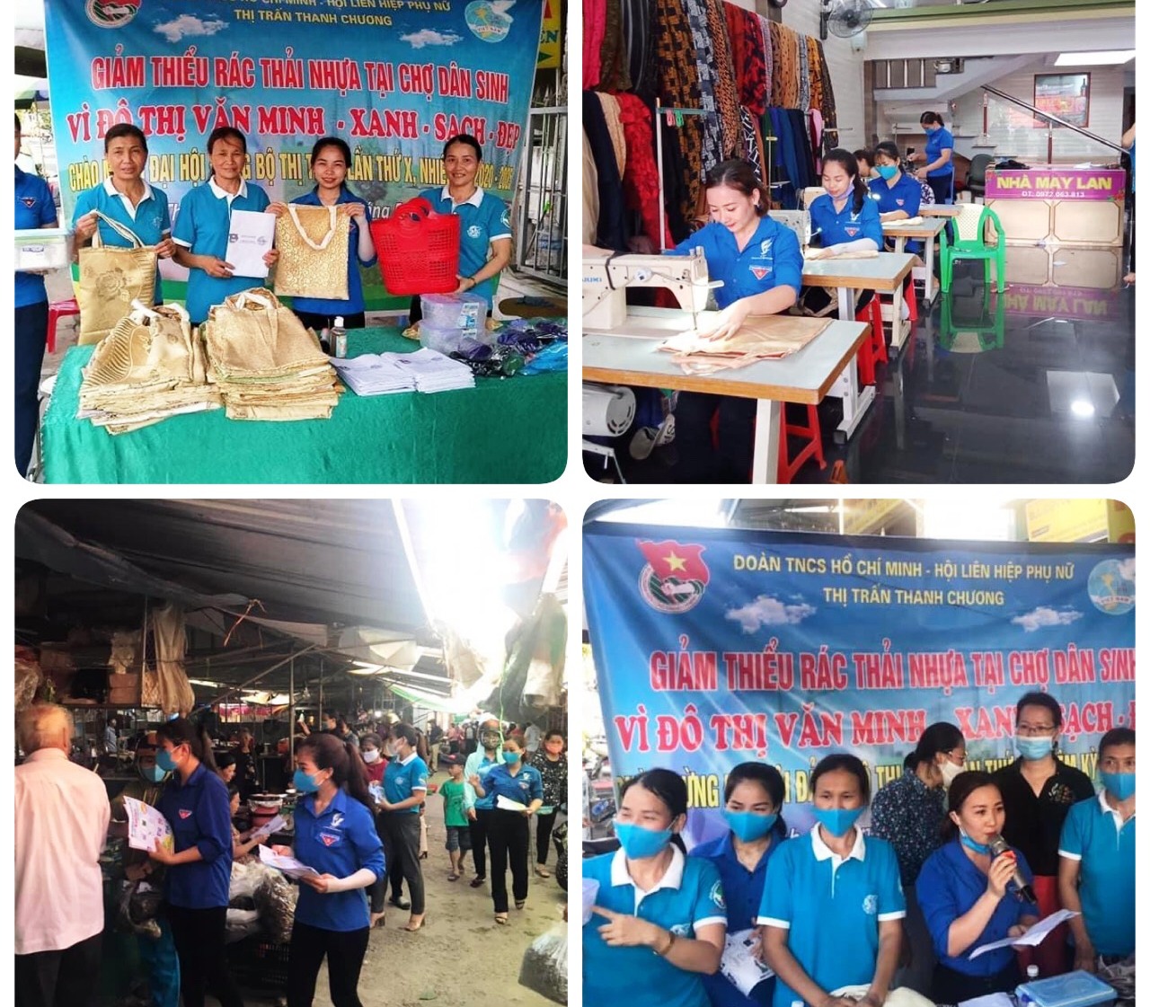 ĐVTN huyện Thanh Chương phát tờ rơi tuyên truyền, tự tay may hàng trăm túi vải, túi giấy,… để tặng cho người dân, các chủ quầy hàng