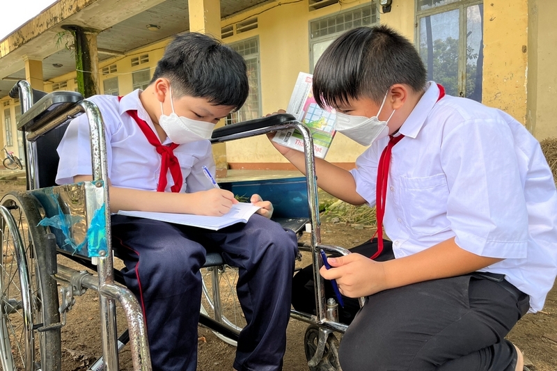 “Giờ ra chơi đến rồi, cậu muốn đi đâu không?/ “Tớ muốn đi vệ sinh”/ “Ừ, tớ đẩy cậu đi”/ “Cảm ơn Lương”. Đẩy đi vệ sinh hay đi chơi trong sân trường… bất kể yêu cầu nào của Lý Nguyên Phúc đều được Đoàn Thành Lương nhiệt tình hỗ trợ. Bởi khi đôi chân đã yếu dần do bệnh, Phúc không thể tự mình thực hiện những việc đó, cần phải có người hỗ trợ.