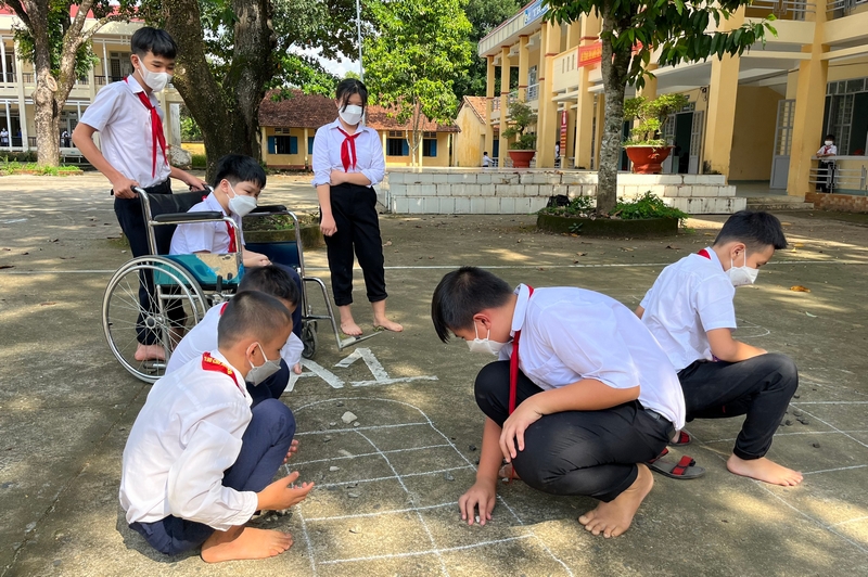 Giờ ra chơi, Lý Nguyên Phúc được các bạn đẩy xe lăn ra sân trường để cùng vui chơi