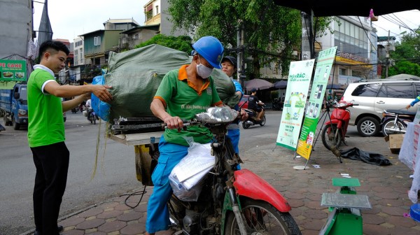 Tại địa điểm thu gom rác tái chế ở ngõ Văn Chương (Đống Đa, Hà Nội), nhân viên môi trường tươi cười chạy đến khuân bao tải rác xuống khi thấy bóng dáng chiếc xe của ông Phạm Văn Hợi (50 tuổi). Với số lượng rác mang đến, ông quy đổi được kha khá dầu gội đầu các loại.