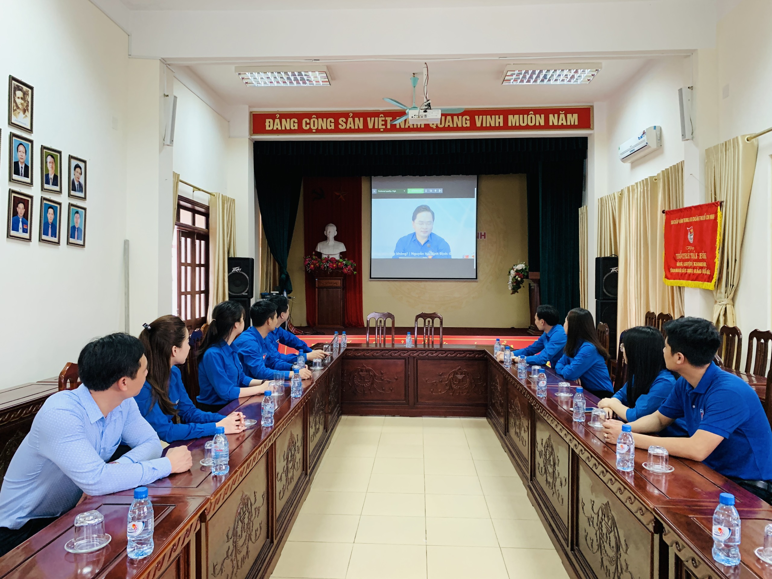 Cán bộ Đoàn tỉnh Thái Bình đang xem buổi đối thoại trực tuyến