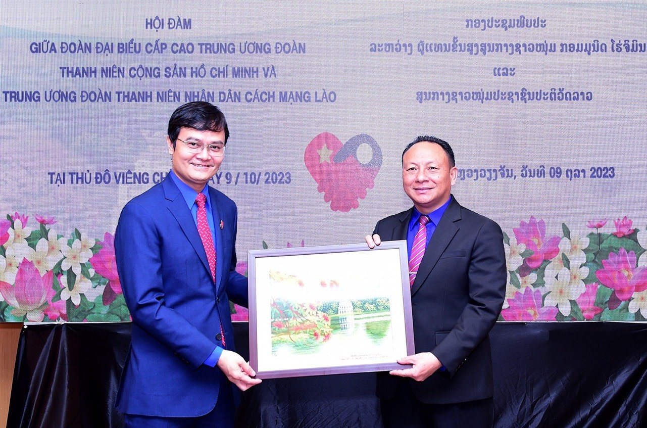 Bí thư thứ nhất T.Ư Đoàn TNCS Hồ Chí Minh Bùi Quang Huy trao tặng quà cho Bí thư T.Ư Đoàn Thanh niên Nhân dân cách mạng Lào Monxay