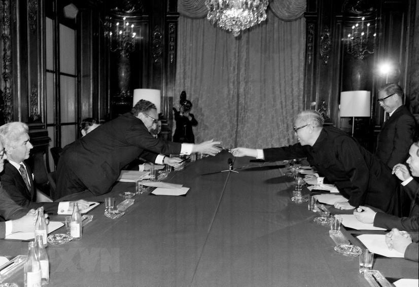 Tại Hội nghị Paris bàn về lập lại hòa bình ở Việt Nam, đồng chí Lê Đức Thọ là cố vấn đặc biệt của Đoàn đại biểu Chính phủ Việt Nam Dân chủ Cộng hòa, trực tiếp đàm phán với đại diện của Chính phủ Mỹ, người góp phần to lớn vào tiến trình đàm phán, dẫn đến ký kết Hiệp định Paris ngày 27/1/1973, buộc Mỹ phải chấm dứt chiến tranh, lập lại hòa bình ở Việt Nam. (Ảnh: TTXVN)