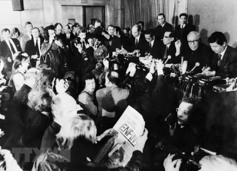 Đồng chí Lê Đức Thọ, Cố vấn đặc biệt của Đoàn đại biểu Chính phủ Việt Nam Dân chủ Cộng hòa họp báo, giới thiệu nội dung Hiệp định Paris về việc chấm dứt chiến tranh, lập lại hòa bình ở Việt Nam vừa được ký tắt (24/1/1973). (Ảnh: TTXVN)