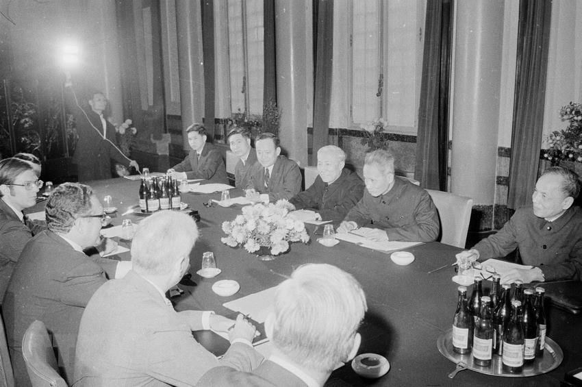 Cố vấn đặc biệt Lê Đức Thọ, Thủ tướng Phạm Văn Đồng và Phó Thủ tướng Nguyễn Duy Trinh trao đổi với Cố vấn đặc biệt của Tổng thống Mỹ, Tiến sỹ Henry Kissinger, trong chuyến thăm Hà Nội (10/2/1973). (Ảnh: TTXVN)
