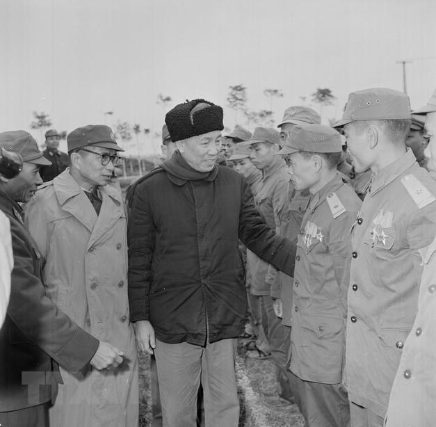 Đồng chí Lê Đức Thọ, Ủy viên Bộ Chính trị đến thăm một đơn vị bộ đội nhân dịp Tết nguyên đán Tân Hợi (2/1971). (Ảnh: TTXVN)