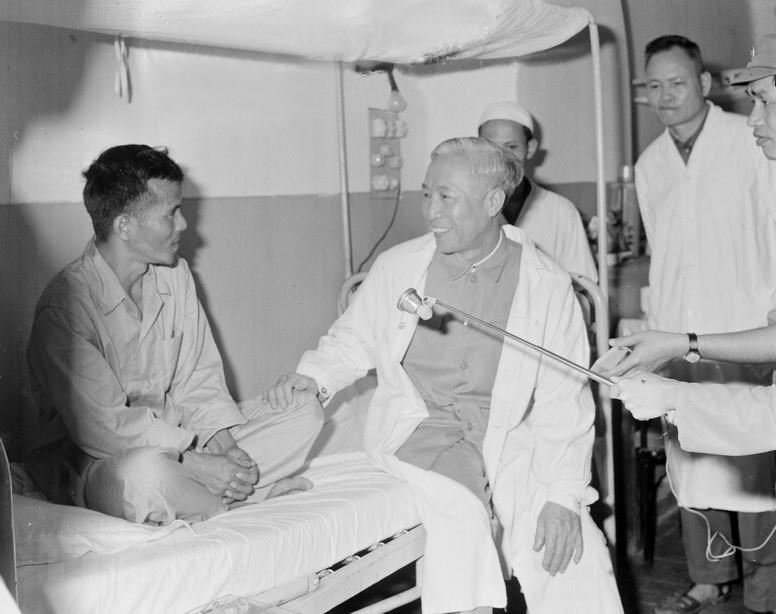 Đồng chí Lê Đức Thọ, Ủy viên Bộ Chính trị, Cố vấn đặc biệt tại Hội nghị Paris về Việt Nam ân cần thăm hỏi Đại úy Từ Minh Kính, sỹ quan liên lạc trong Tổ liên hợp quân sự 4 bên tại khu vực Buôn Ma Thuật, đang nằm điều trị tại Quân y viện 108 (3/1973). (Ảnh: TTXVN)