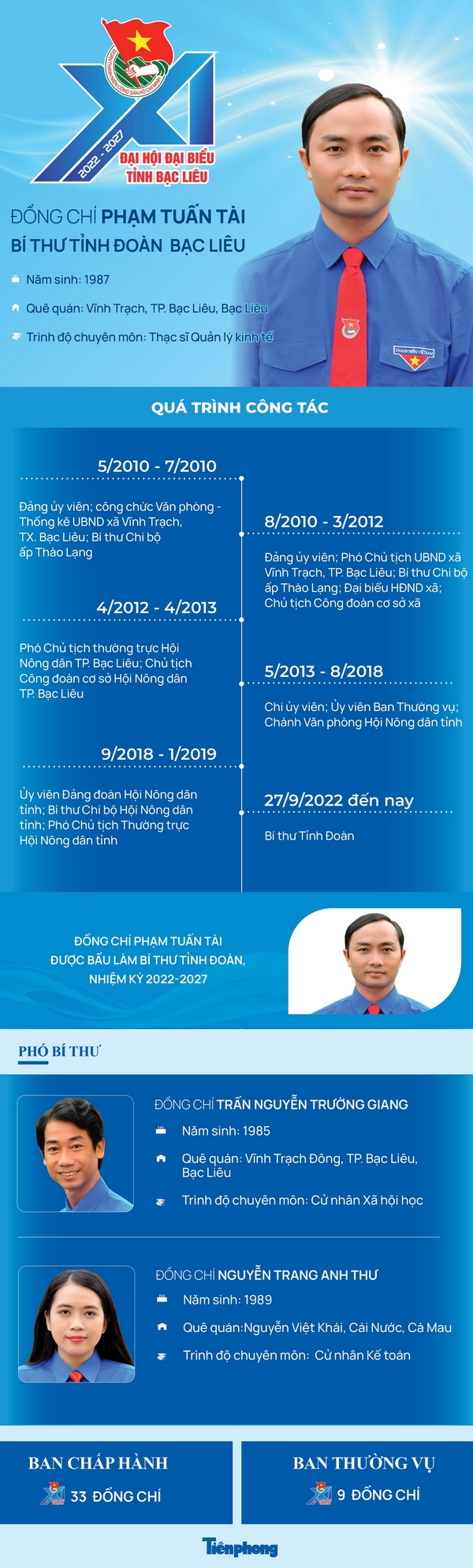 Đại hội đại biểu Đoàn TNCS Hồ Chí Minh tỉnh Bạc Liêu lần thứ XI, nhiệm kỳ 2022 – 2027, công bố Ban Chấp hành gồm 33 đồng chí. Đồng chí Phạm Tuấn Tài, Bí thư Tỉnh Đoàn khóa X, nhiệm kỳ 2017 - 2022 được bầu làm Bí thư Tỉnh Đoàn khóa XI, nhiệm kỳ 2022 - 2027.