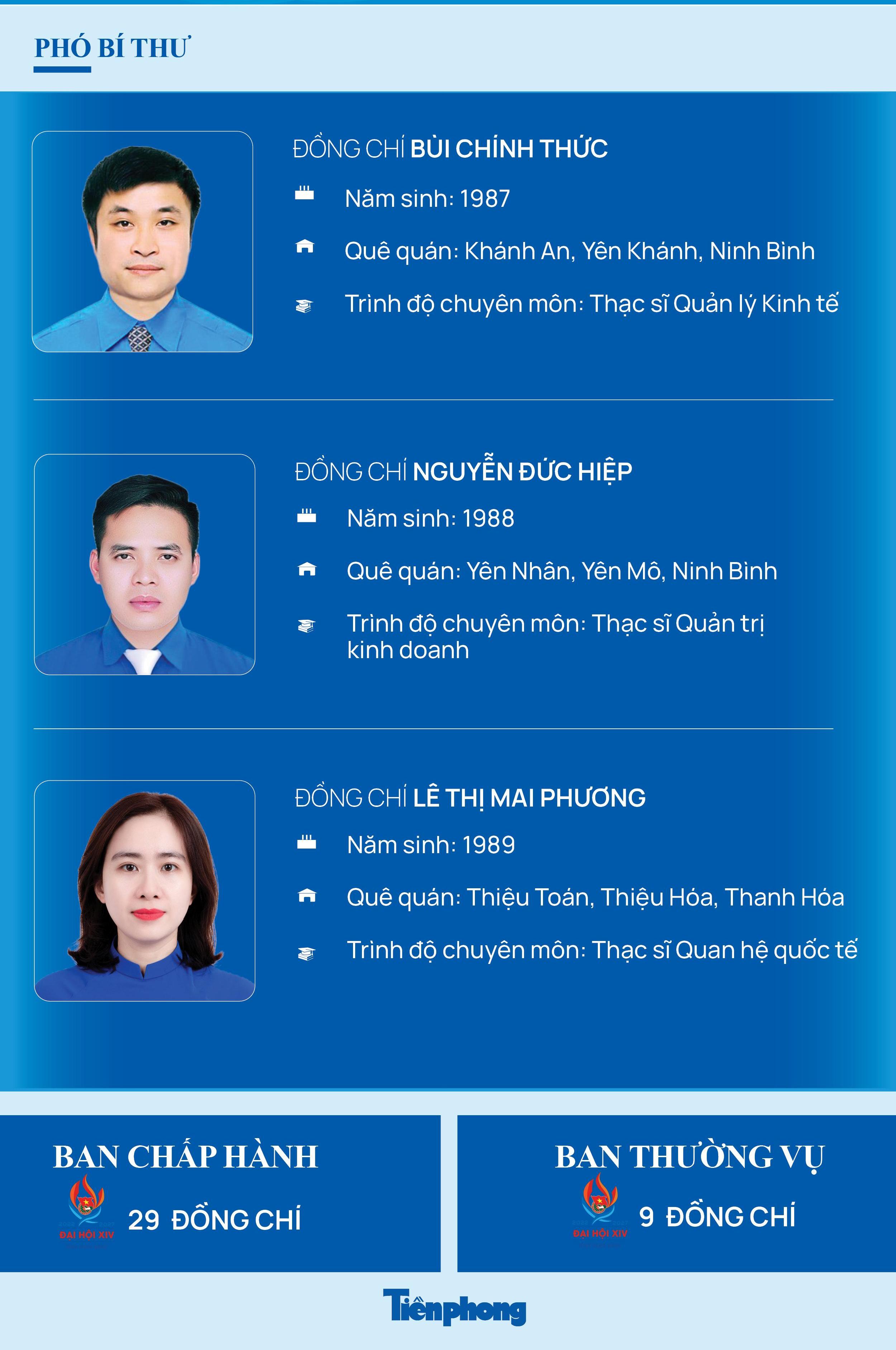Hội nghị bầu 3 Phó Bí thư Tỉnh Đoàn khóa XIV gồm: Đồng chí Bùi Chính Thức (SN 1987, quê Ninh Bình, trình độ Thạc sĩ Quản lý Kinh tế); đồng chí Nguyễn Đức Hiệp (SN 1988, quê Ninh Bình, trình độ Thạc sĩ Quản trị Kinh doanh); đồng chí Lê Thị Mai Phương (SN 1989, quê Thanh Hóa, trình độ Thạc sĩ Quan hệ quốc tế).