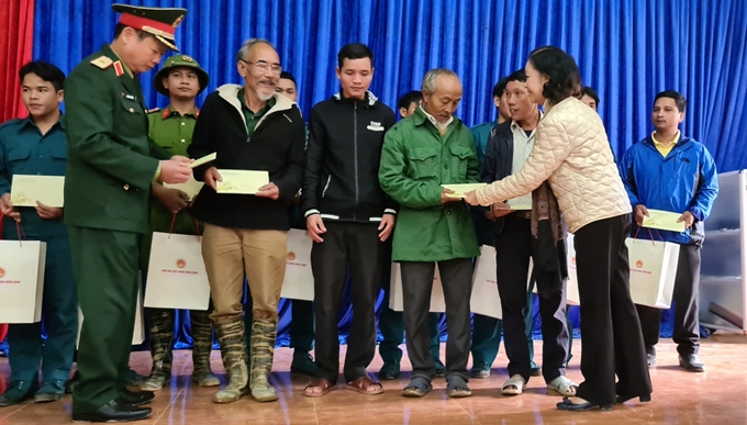 Thay mặt đoàn công tác, đồng chí Trương Thị Mai trực tiếp trao các phần quà tết và động viên, chia sẻ với người dân xã Trà Leng